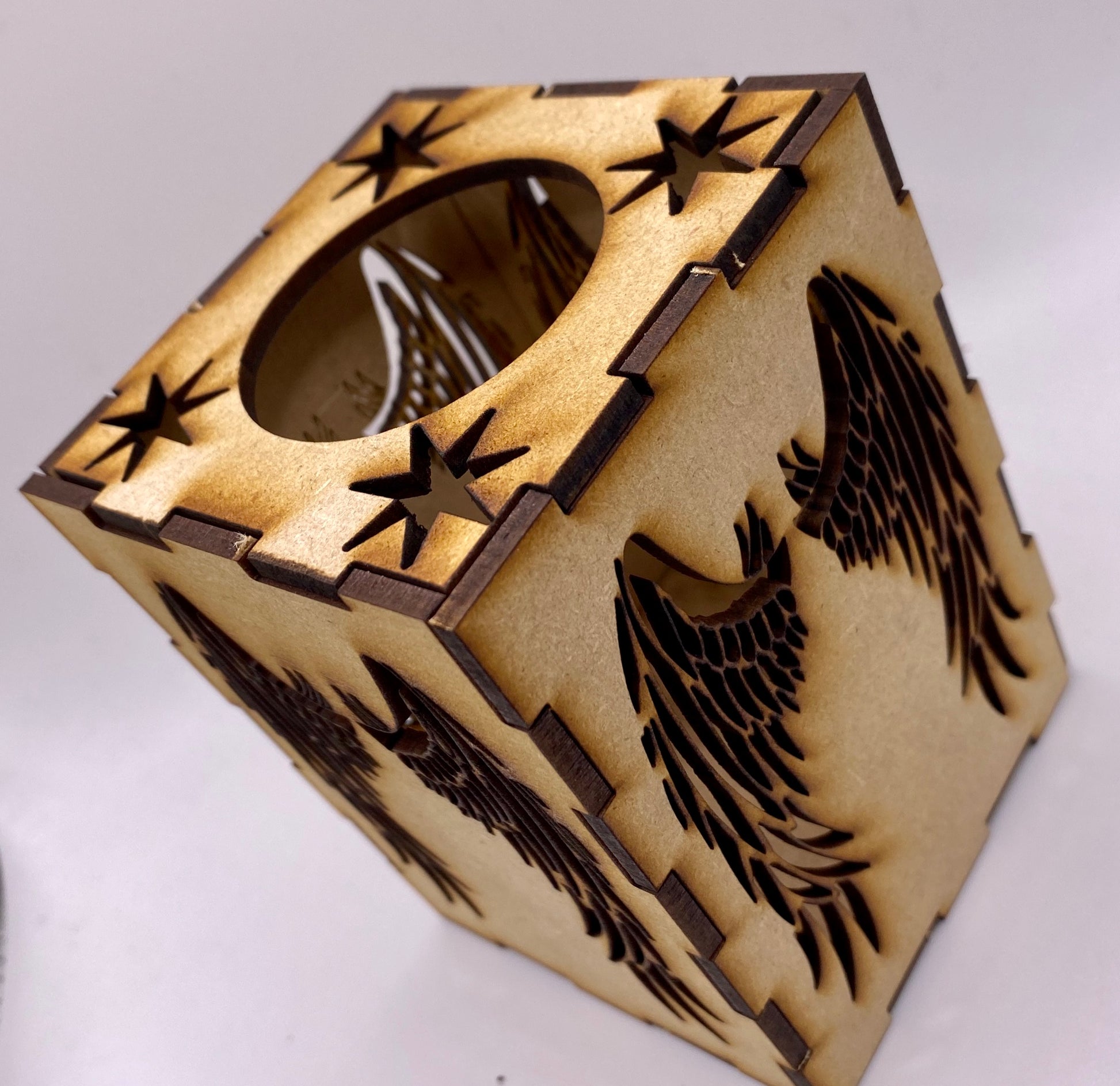 A stunning four-sided Lantern with Beautiful Angel Wings pattern on each side. The lantern has a round hole at the top to allow easy access to put your battery-operated candles or LED lights inside. It looks stunning at night with lights inside!