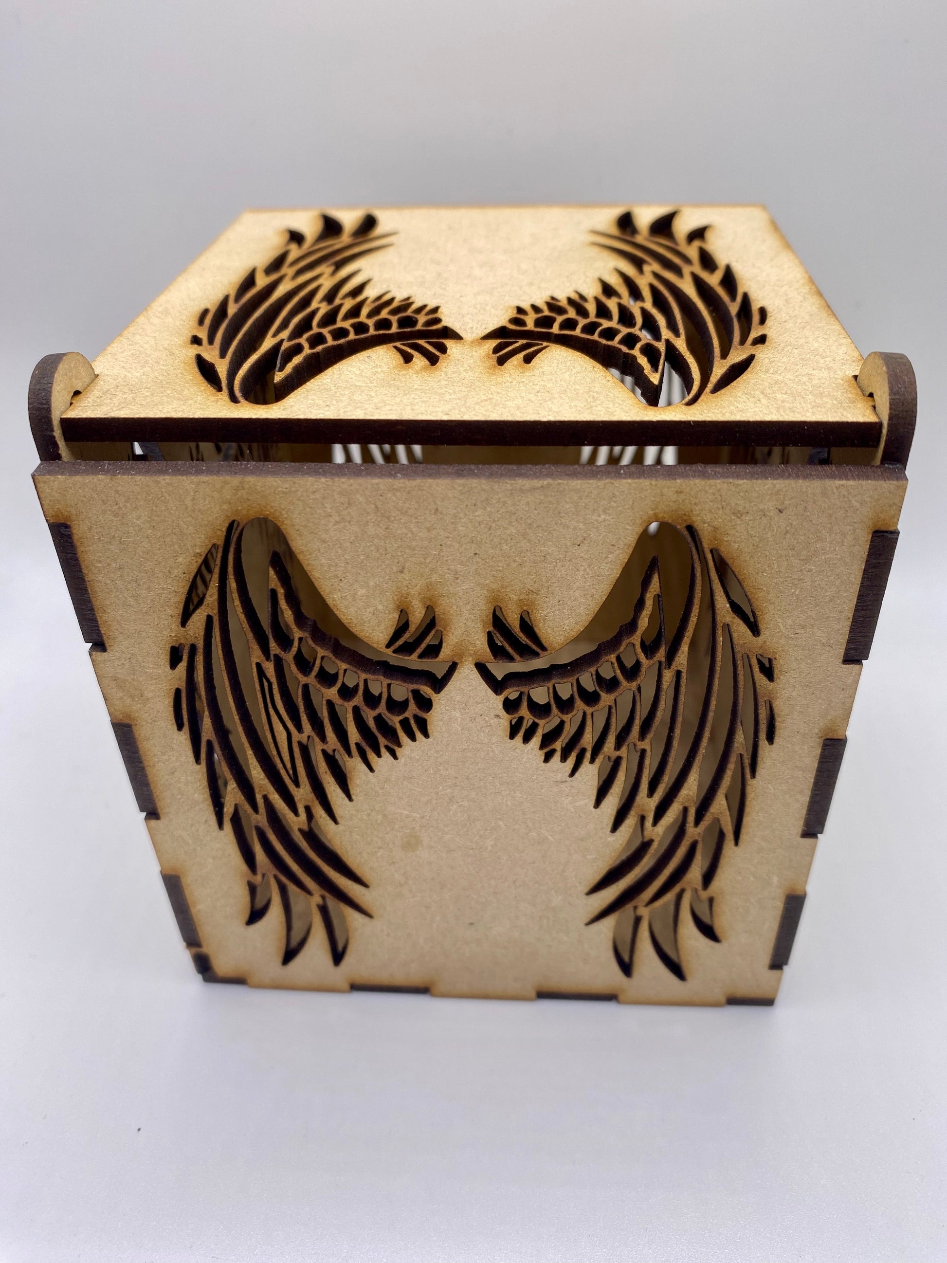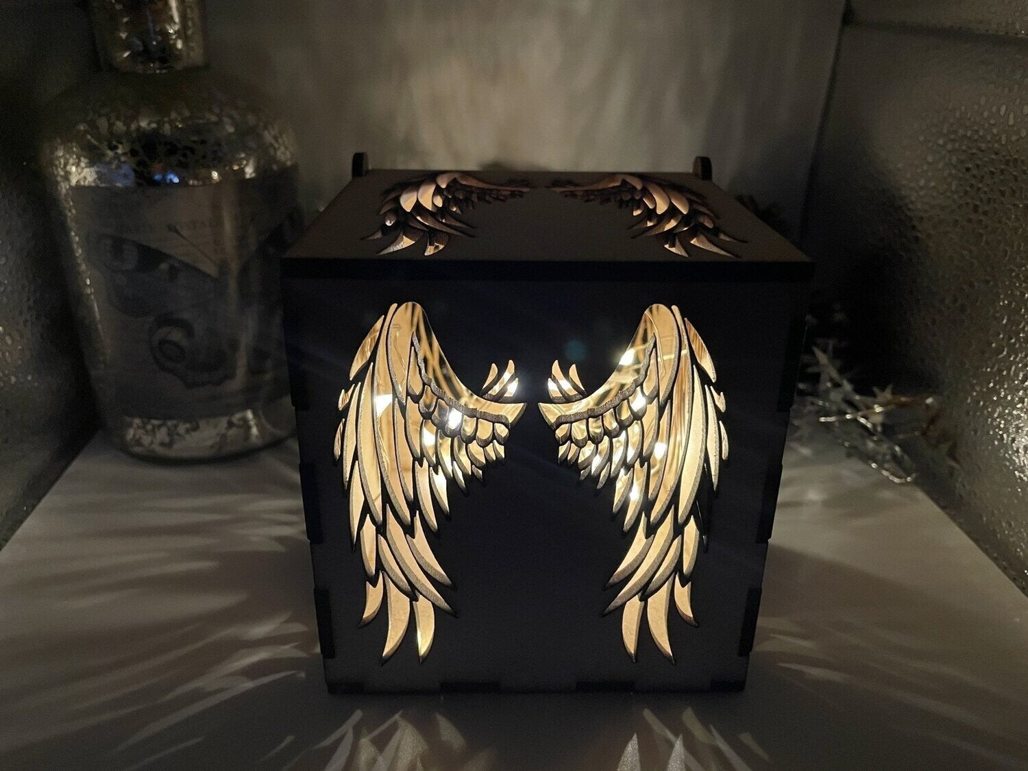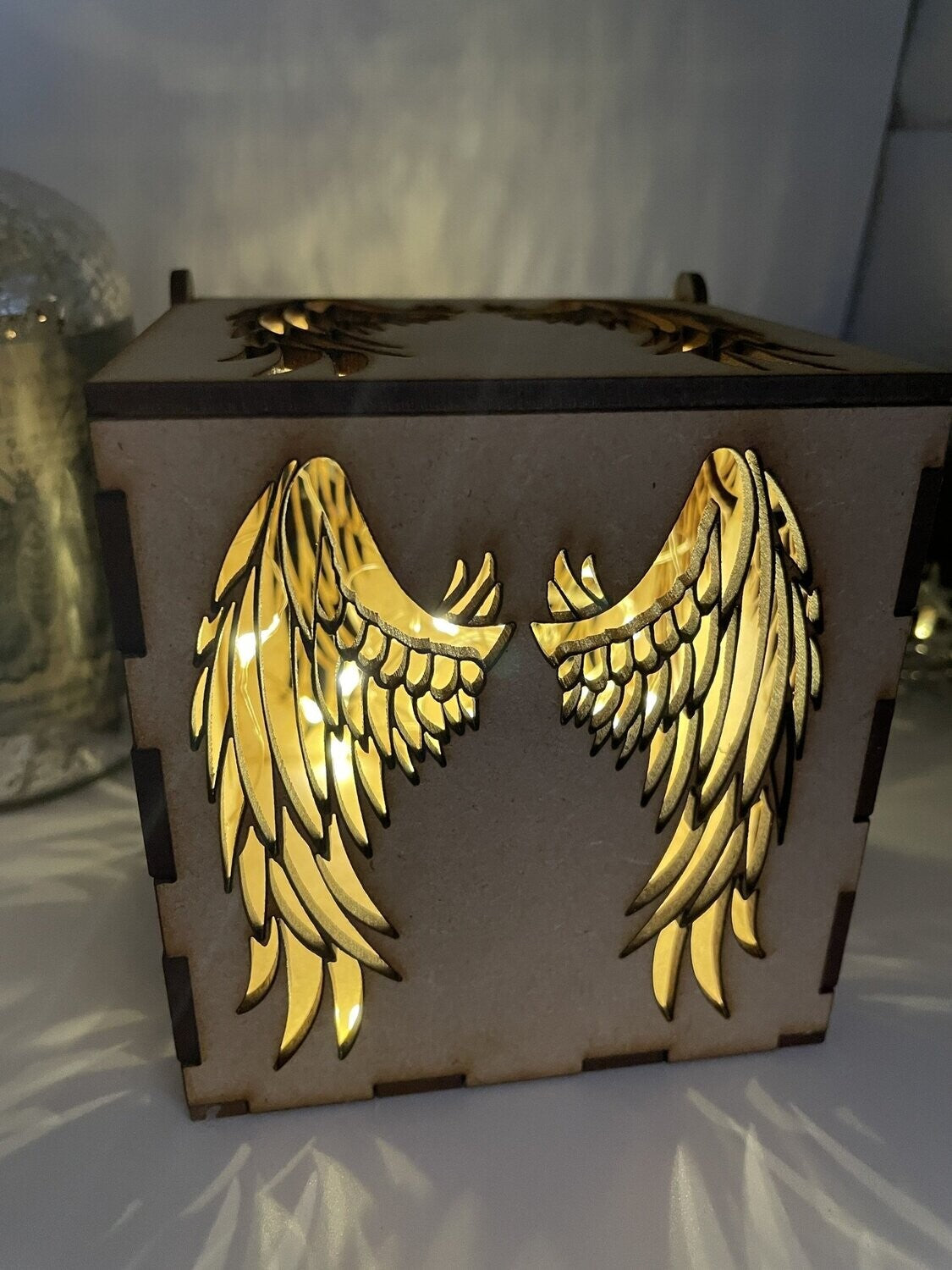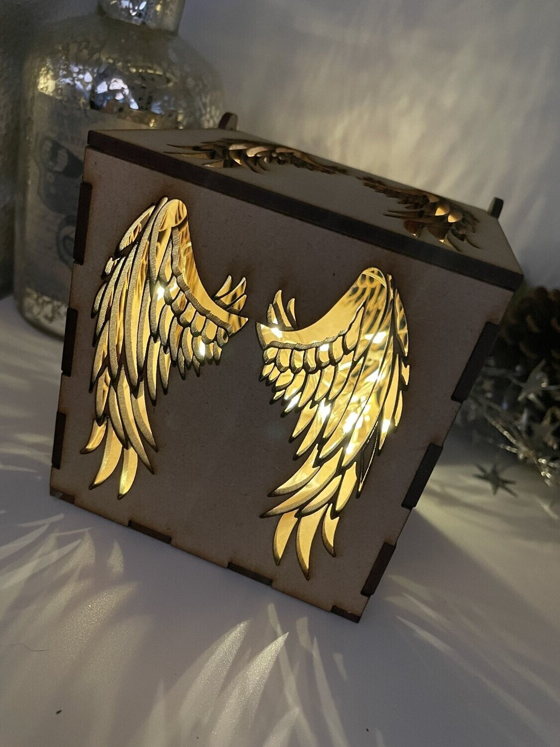 A stunning box that can be used as a lightbox by housing battery-operated candles or LED lights inside. Once lights are inside they illuminate the angel wings giving off a gentle glow that looks stunning. Great for decorations or memorials.