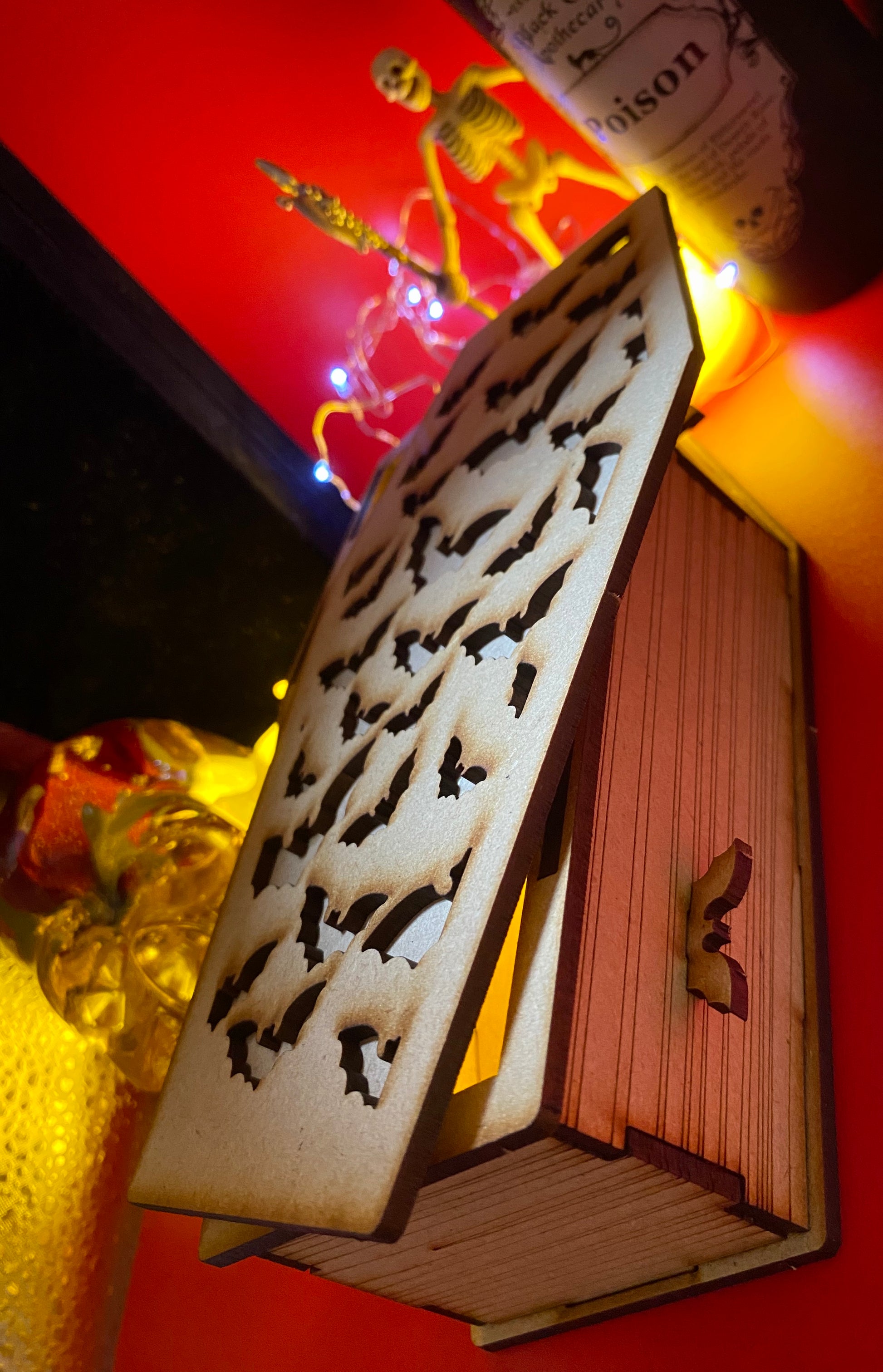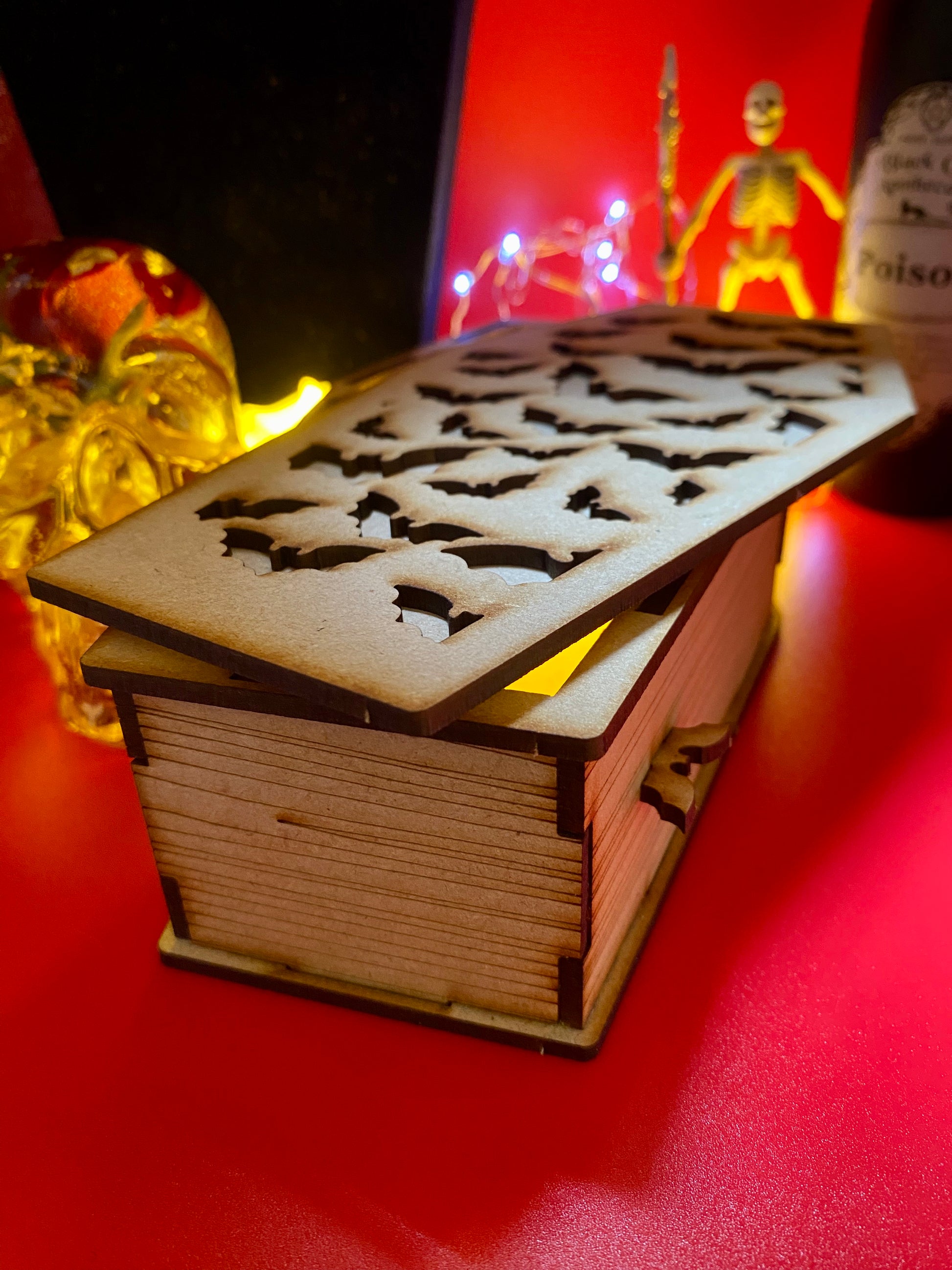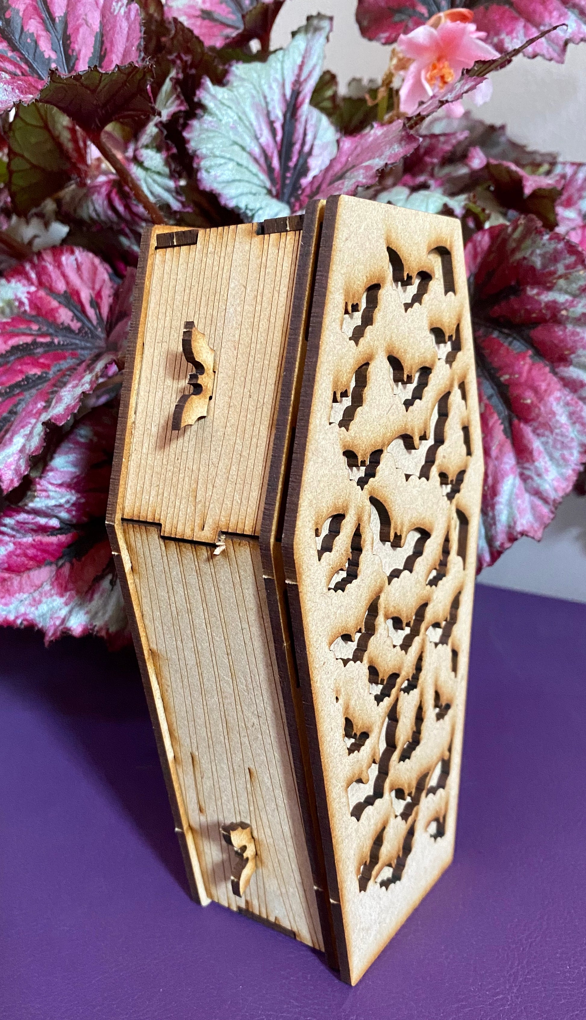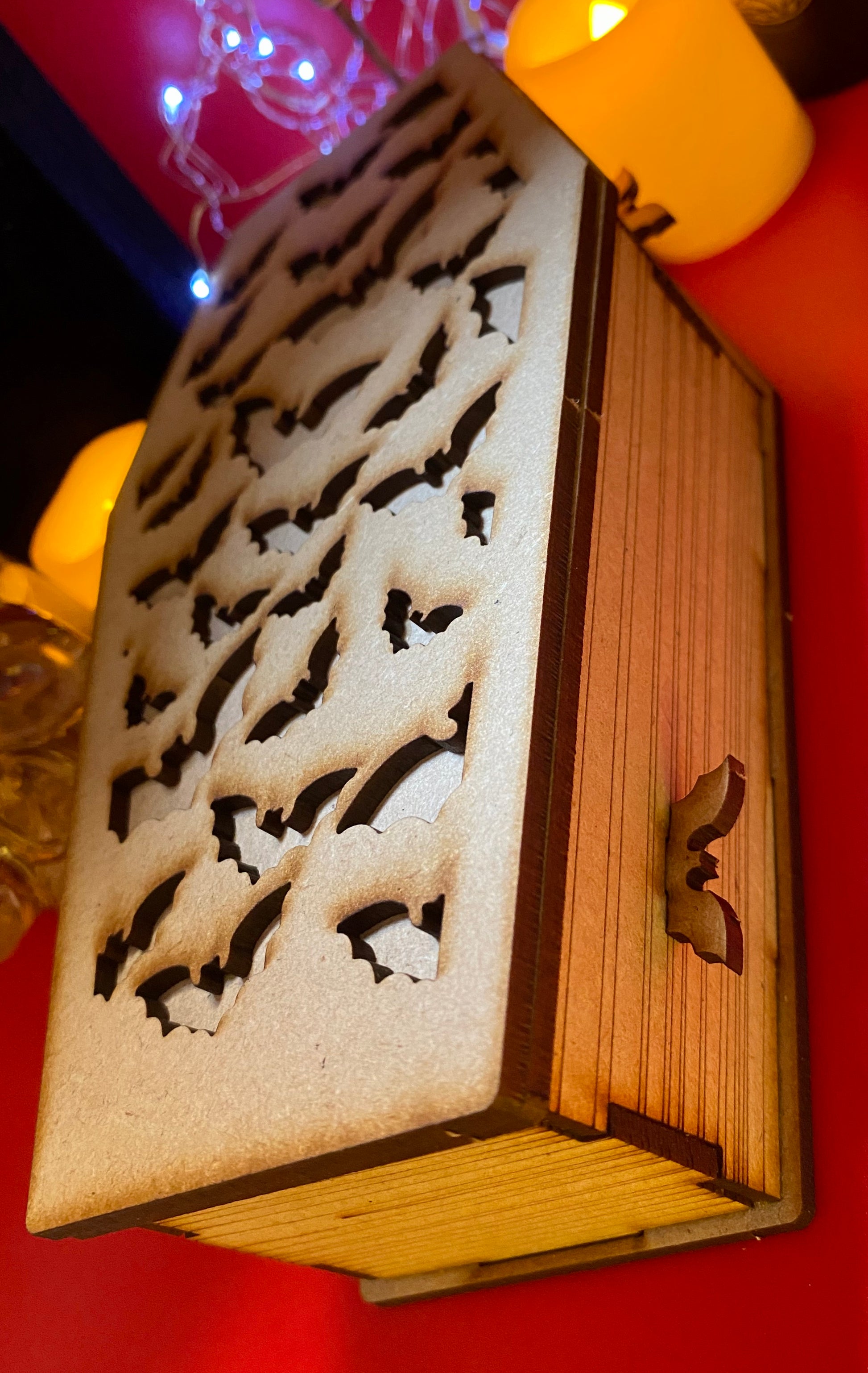 This Bat Coffin Box goes great with our Bats Lantern which you can see here-https://www.etsy.com/uk/listing/1308183854/bat-night-light-lantern-halloween-gothic?click_key=b1d7d554fddb38dcb19752769322321fcfa8e8e6%3A1308183854&click_sum=0c2eb9b2&ref=hp_rv-1