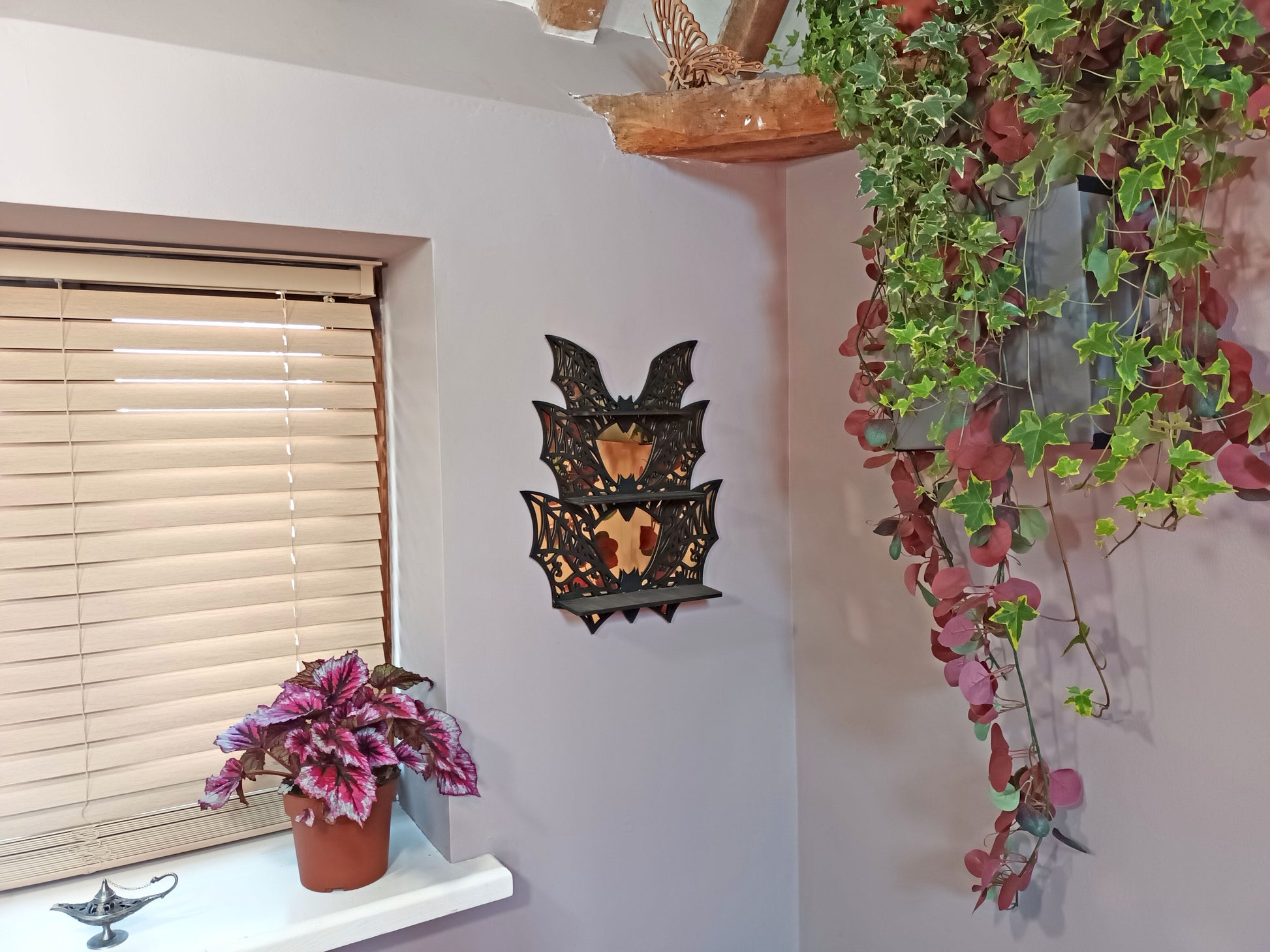 A stunning Bat Shelf that can be supplied with or without mirror backing. Choice of 2 sizes. Ideal to show off small trinkets, Crystals or to house battery-operated candles to add ambiance.