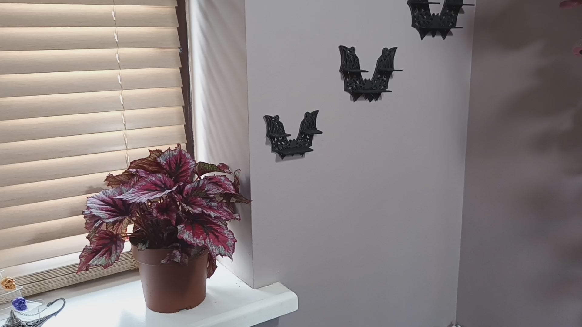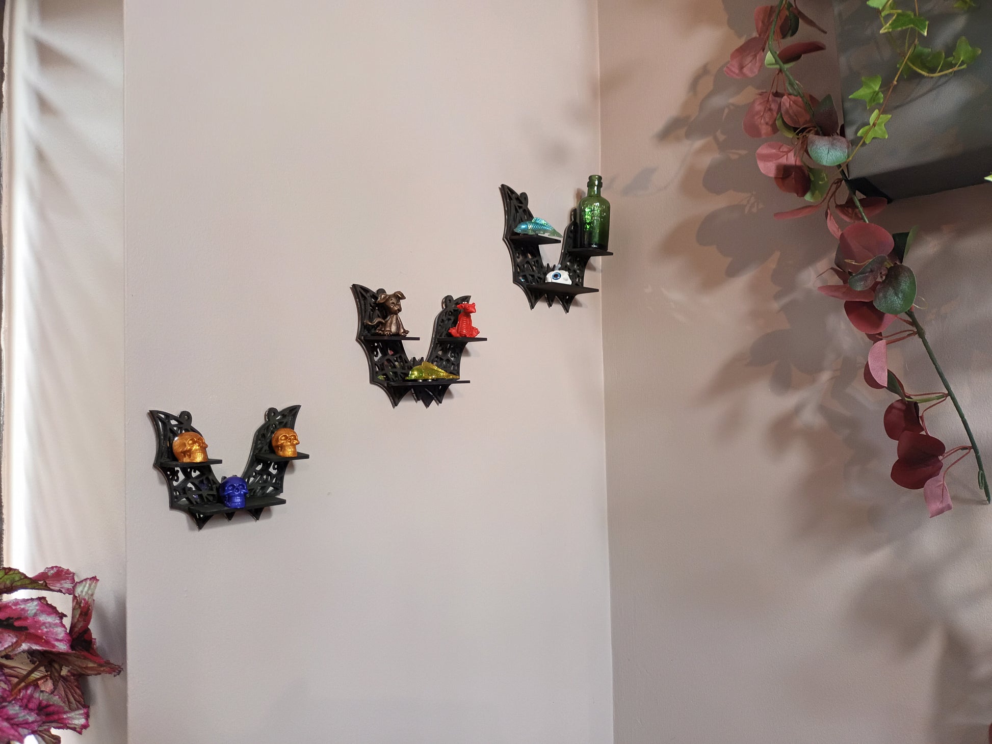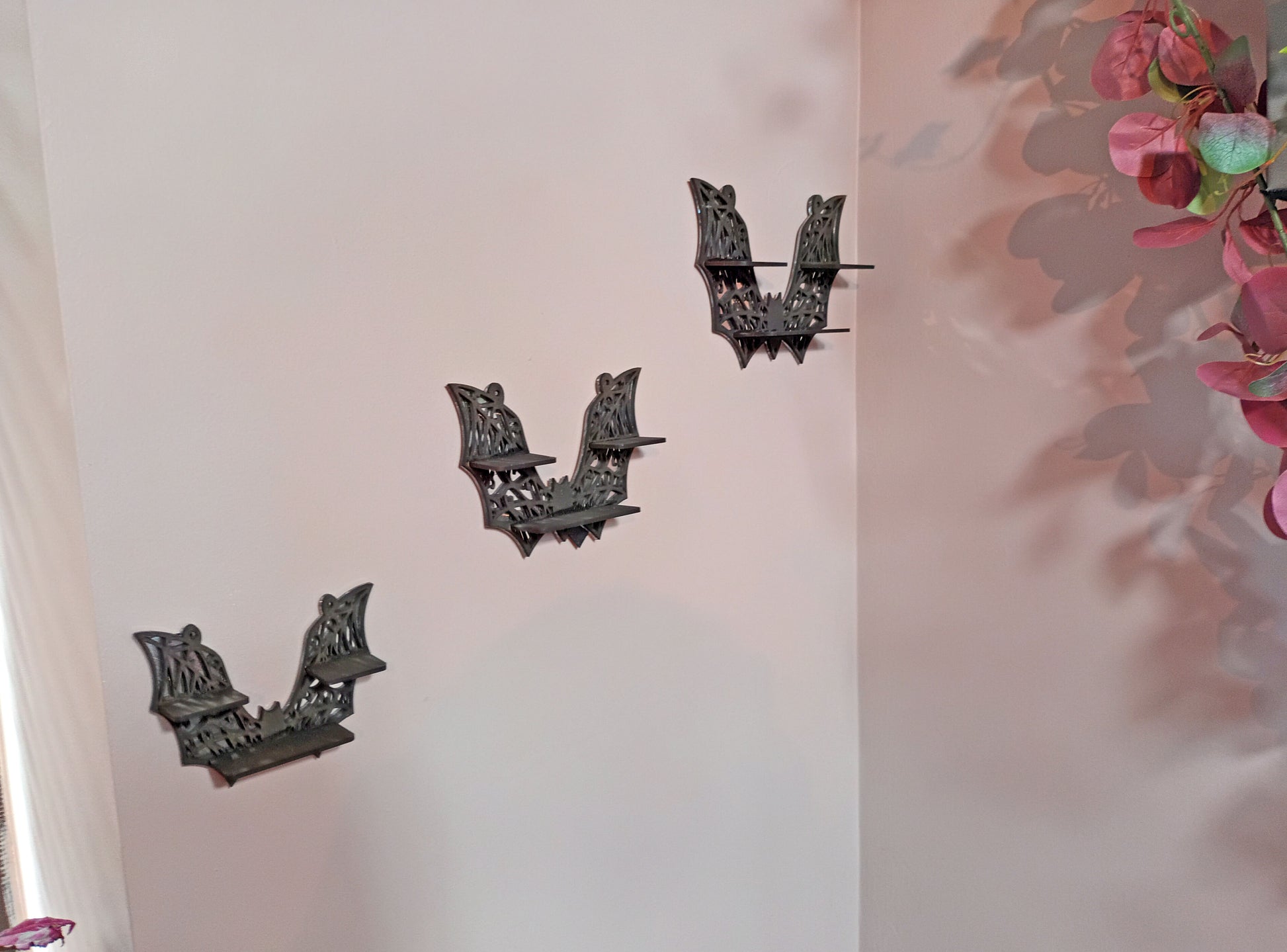 A set of stunning Bat Shelves with or without mirror backing. Ideal for small trinkets to show off or to house battery-operated candles to add ambiance.