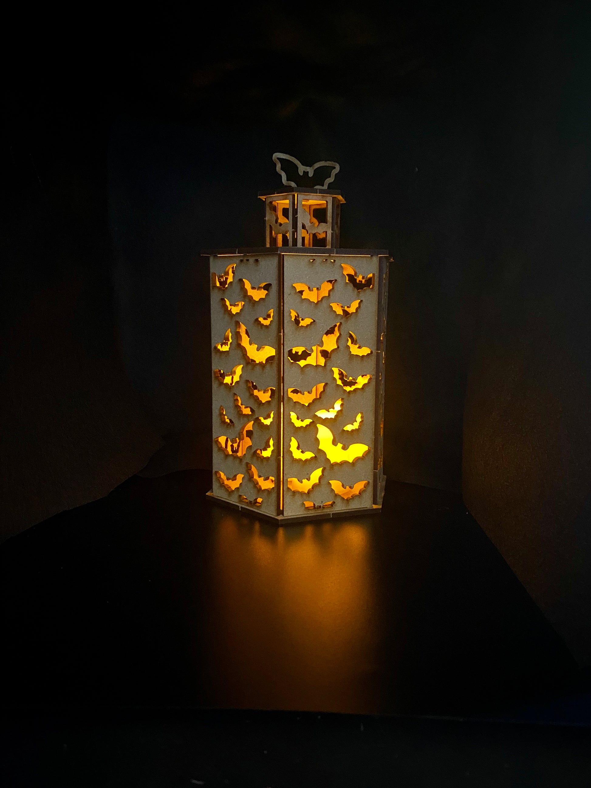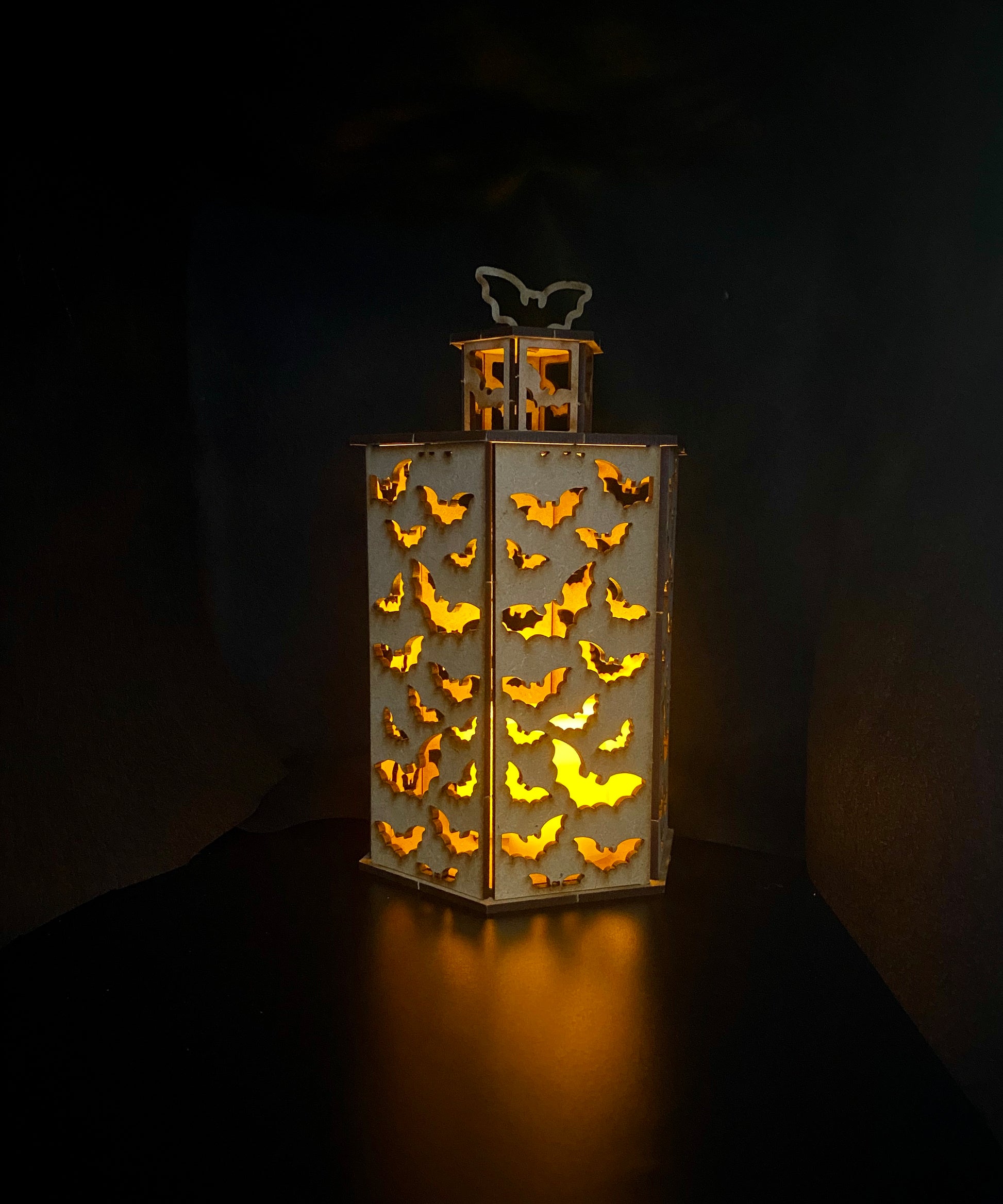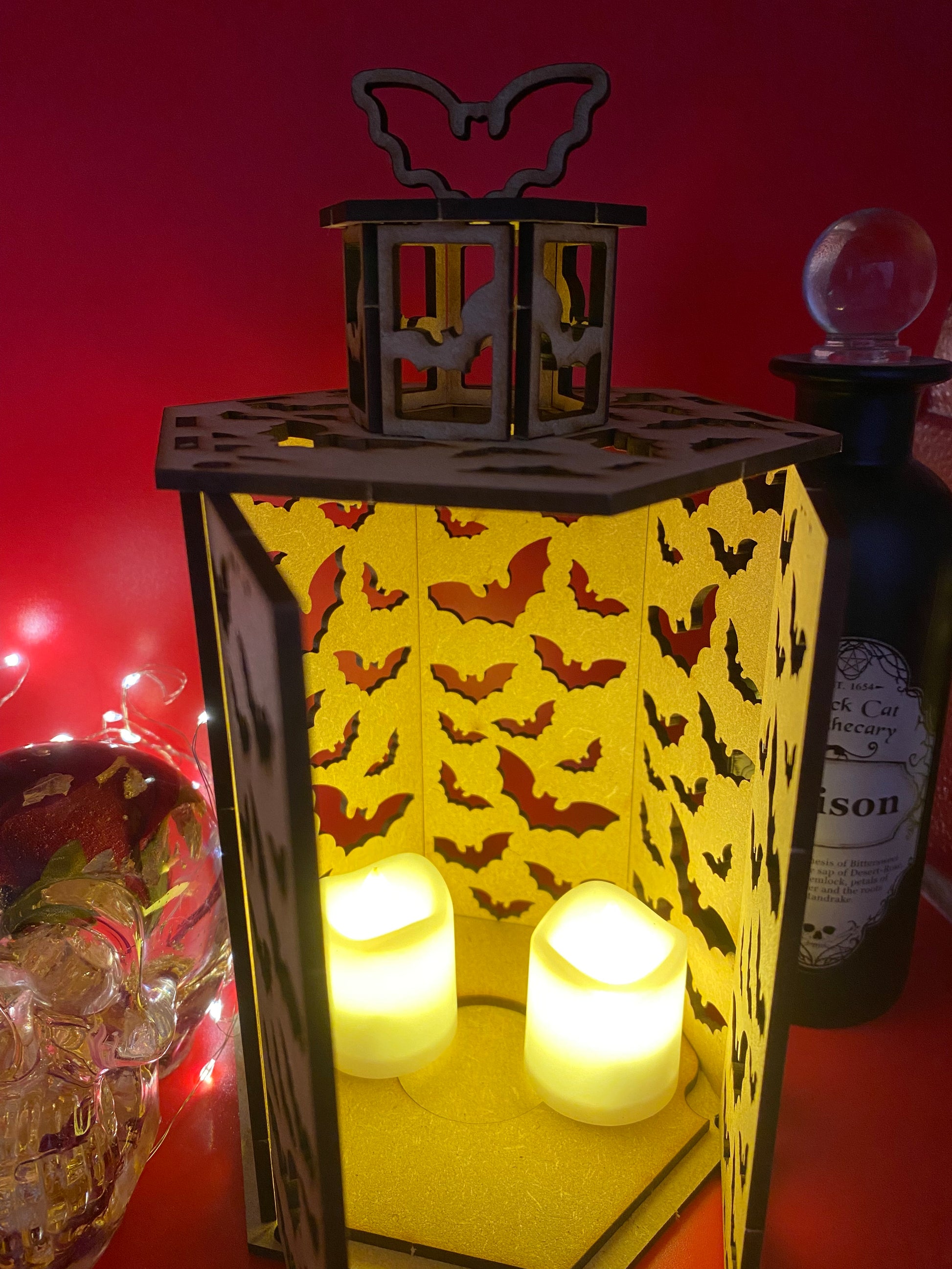 A stunning six-sided Lantern with Bats on each panel and on the top! The lantern has two opening doors to allow easy access to put your battery-operated candles or LED lights inside. Cute Bat shaped handle at the top to carry it easily.