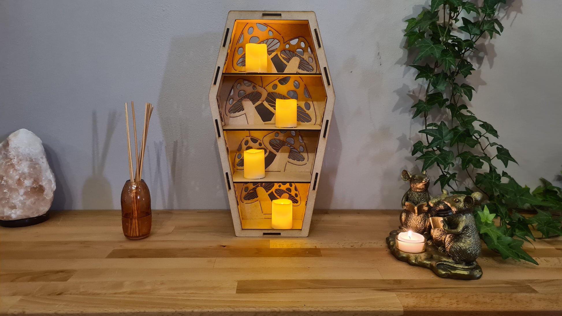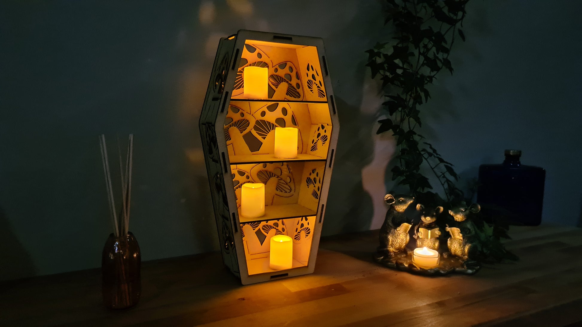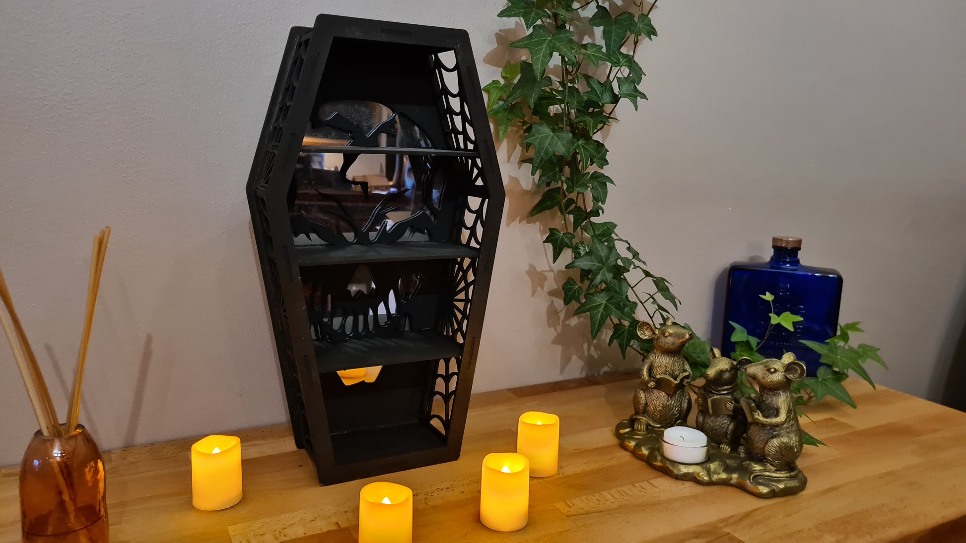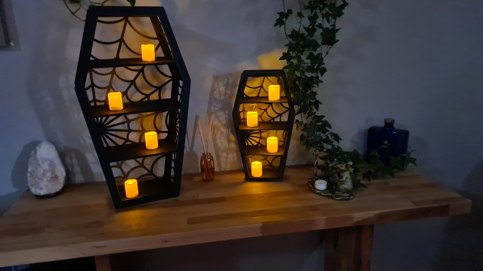 Here we have stunning Coffin Shelving with or without mirror backing. Choice of 3 designs. Skull, Spiders Web, or Bat. Ideal for small trinkets to show off or to house battery-operated candles to add ambiance.