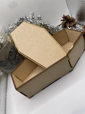 A stunning coffin box, 3D MDF Box with a lid and Cross Cut-out, that can be used as a storage box for pens, makeup, or knickknacks. The box has a solid base and an easy-opening lid. You will need to assemble the box yourself as it is sent out flat-packed, it is easy to assemble and secure using PVA glue.