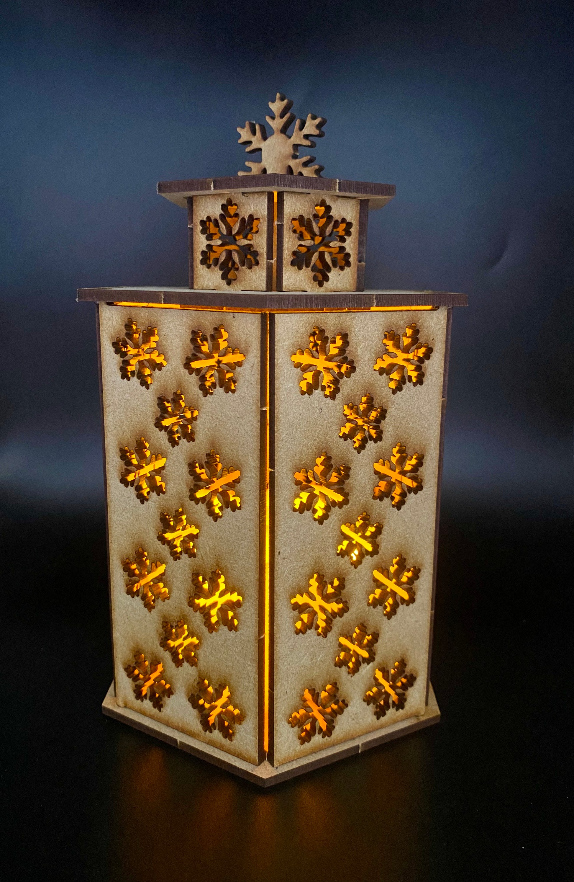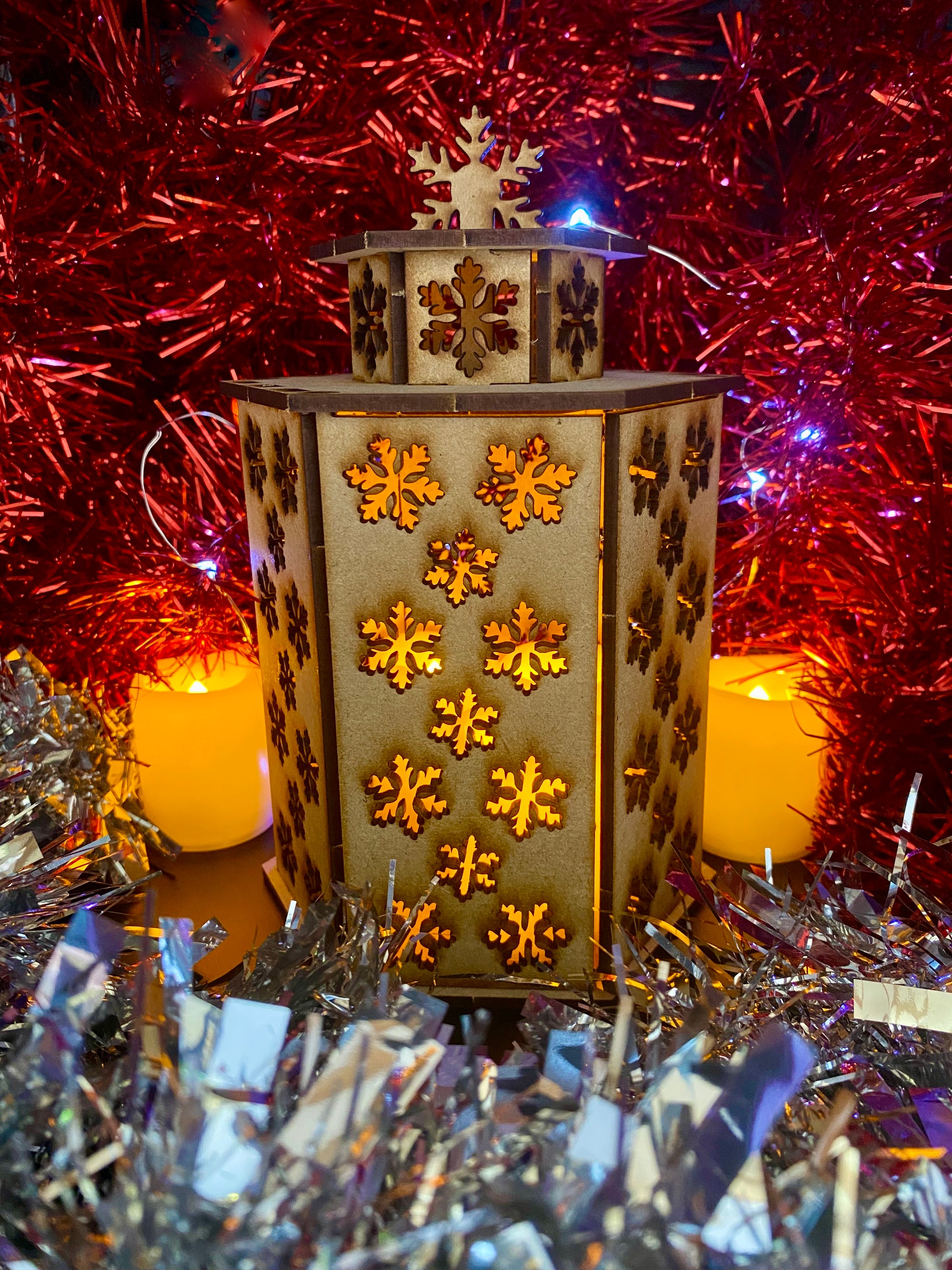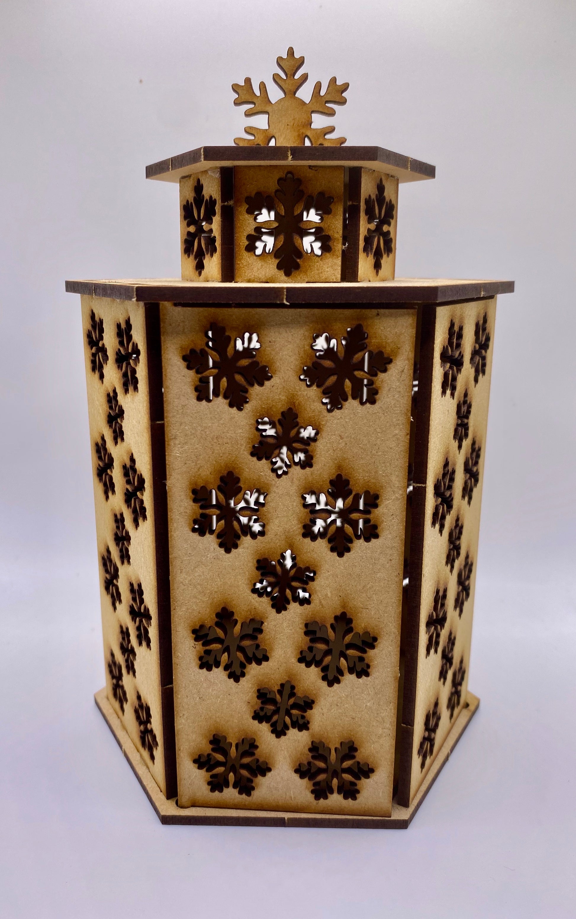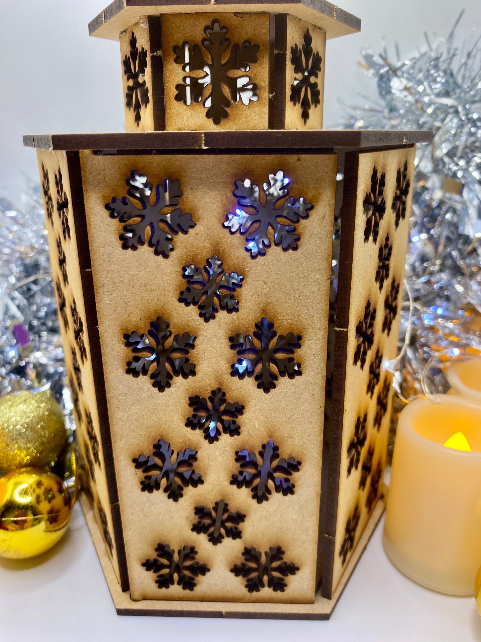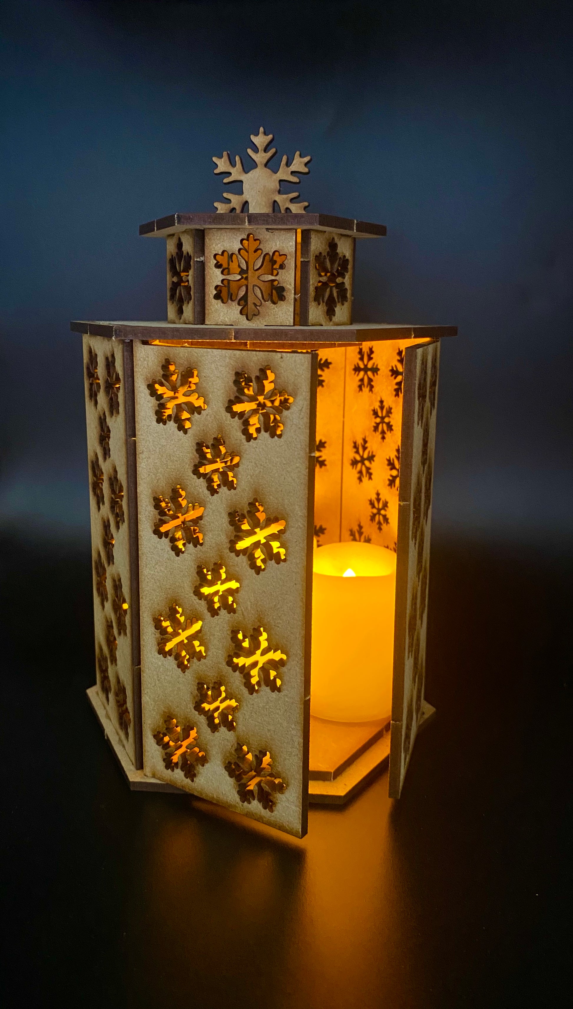 A stunning six-sided Lantern with cut-out with snowflakes on each side. Has two opening doors to allow easy access to put your battery-operated candles or LED lights inside. Handle at the top to carry it easily.