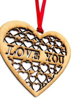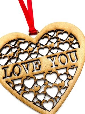 The perfect token for someone special this Valentines Day! Laser Cut for precision with all edges being smooth to the touch, this heart has 'Love You' in the centre with a heart pattern around it. Finished off with a vibrant red satin ribbon loop to hang it up with.
