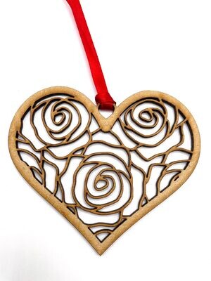 The perfect token for someone special this Valentines Day! Laser Cut for precision with all edges being smooth to the touch, this heart has a rose pattern running through it. Finished off with a vibrant red satin ribbon loop to hang it up with.