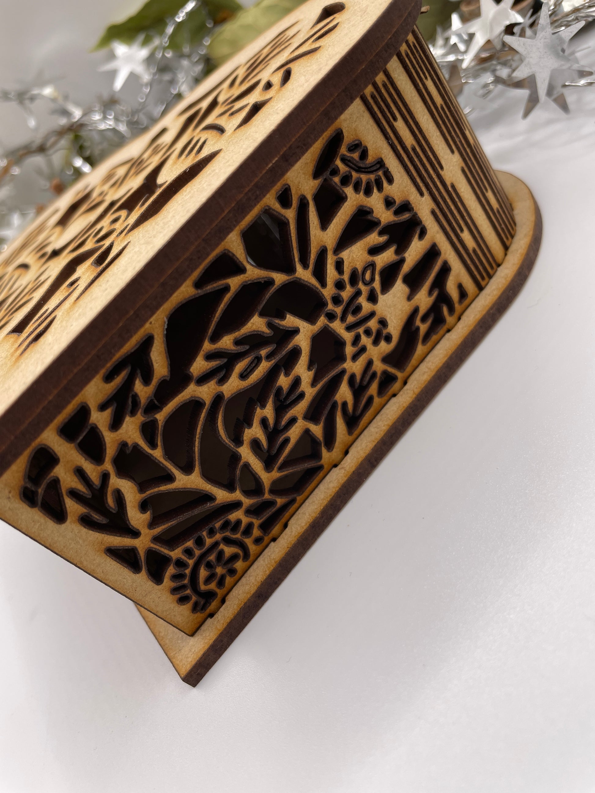 A stunning box with intricate leaf patterns on the lid and also on the sides. The box can be used as a storage box for knickknacks, and trinkets or could even be used as a light box if you put string LED lights inside it.