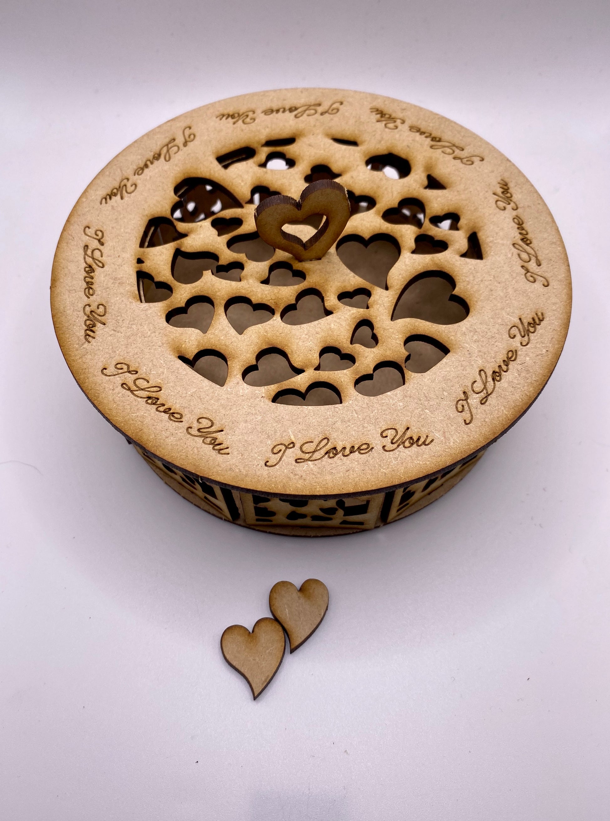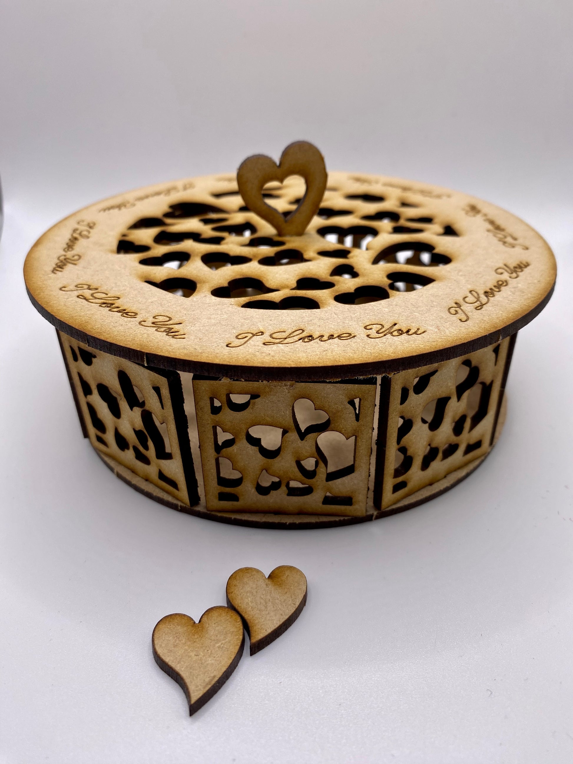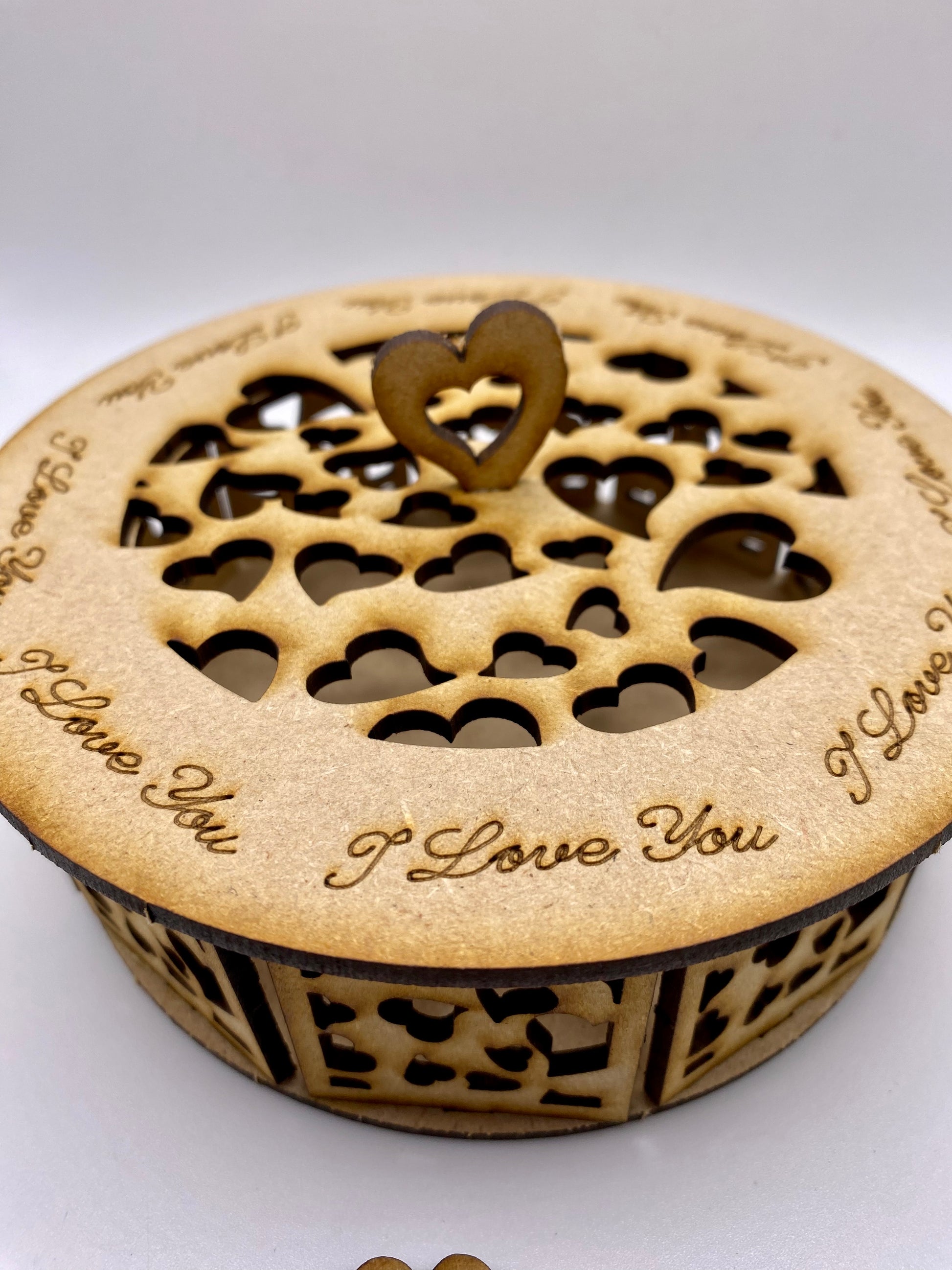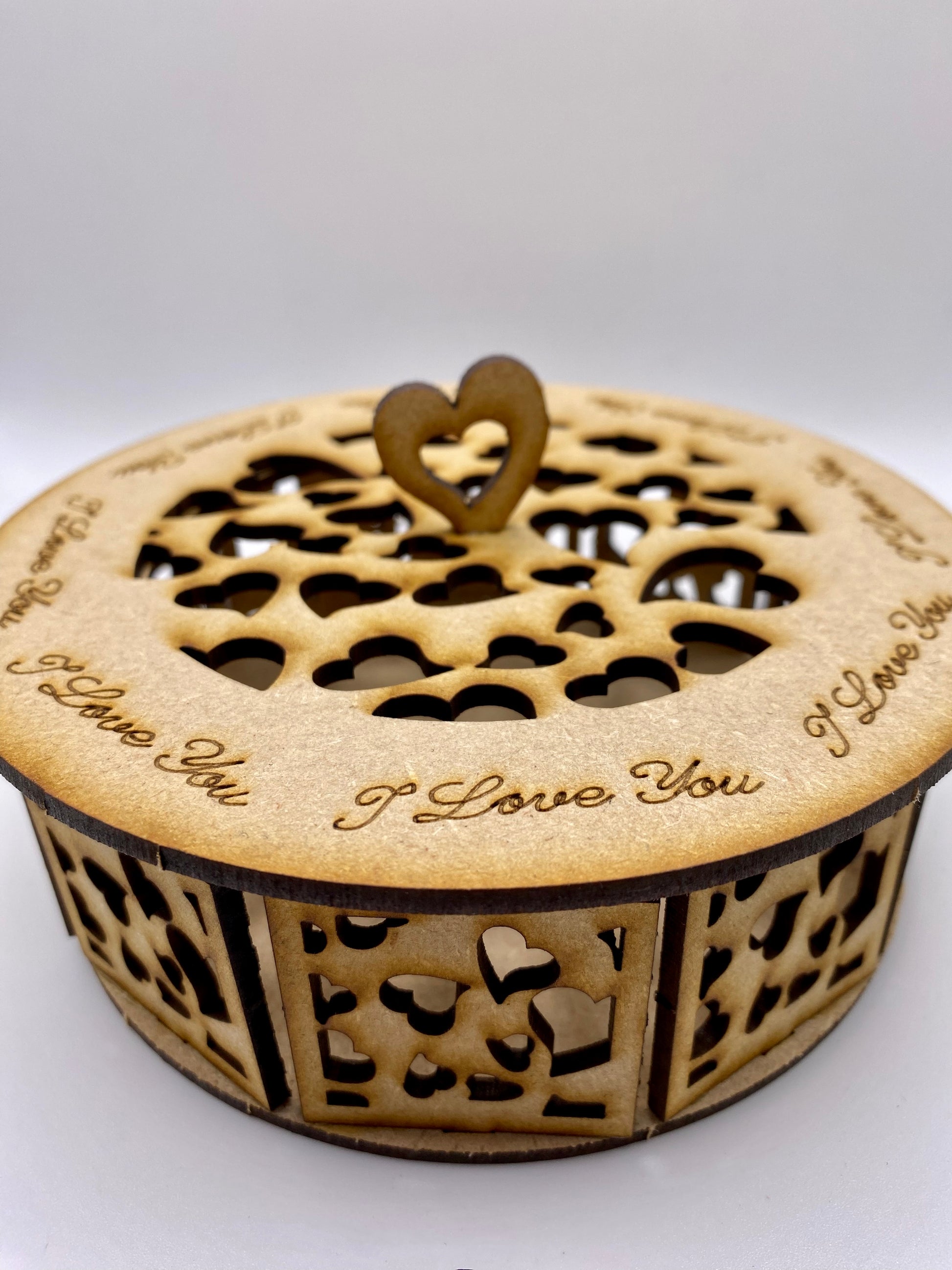 A stunning round Trinket Storage Box with Beautiful Hearts all around the sides and on the top with I Love You around the edge of the lid. The box has an easy-fitting lid with a Gorgeous heart-shaped handle. It can be used to put your battery-operated candles or LED lights inside to create a cute ambiance in your room or used as a traditional trinket box to store all your odds and ends.