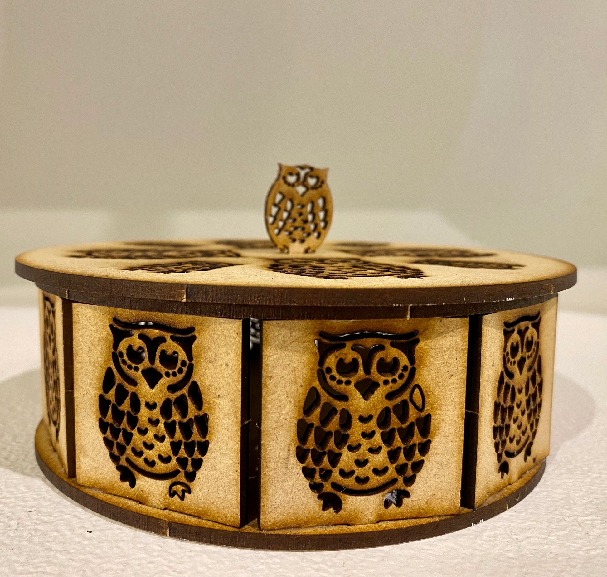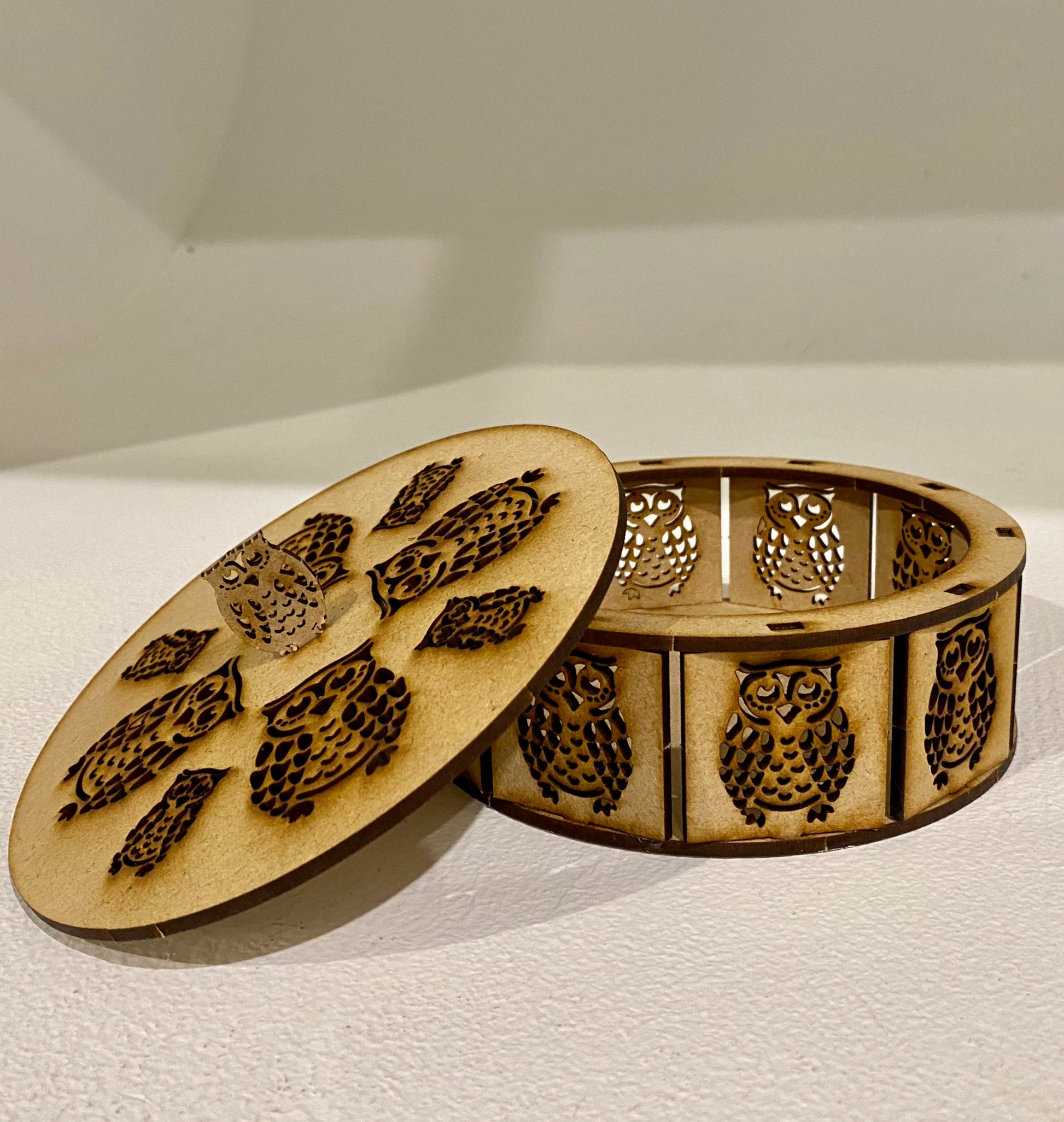 A stunning round Trinket Storage Box with Stunning Owls all around the sides and on the top. The box has an easy-fitting lid with a Beautiful Owl shaped handle. It can be used to put your battery-operated candles or LED lights inside to create a cute ambiance in your room or used as a traditional trinket box to store all your odds and ends.