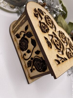 A stunning box with an intricate rose pattern on the lid and also on the sides. The box can be used as a storage box for knickknacks, and trinkets or could even be used as a light box if you put string LED lights inside it.
