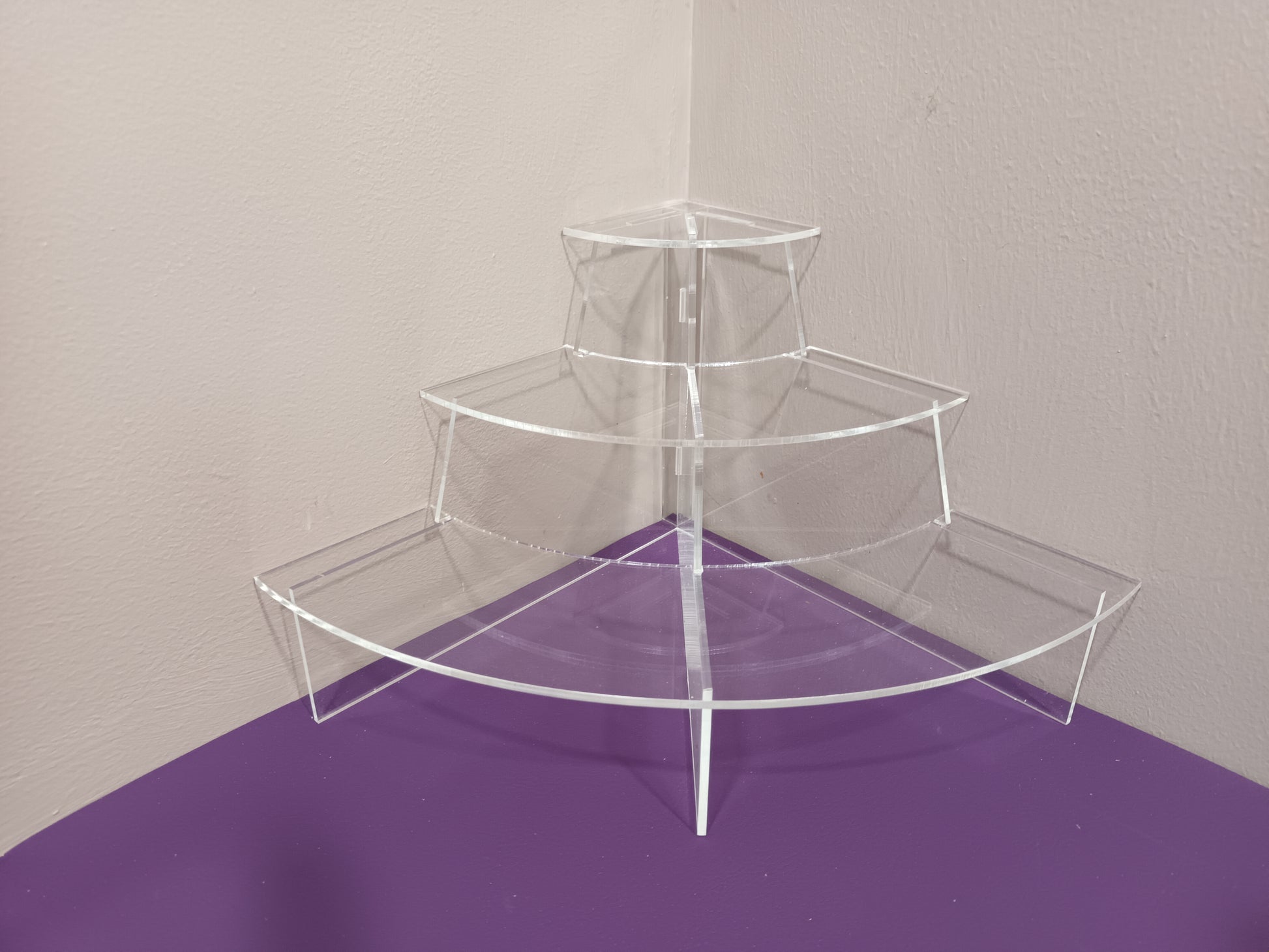 Acrylic display shelf with 3 layers of shelves. Each shelf is deep enough to display many items at once, while the items remain clearly visible and easily accessible to potential customers.