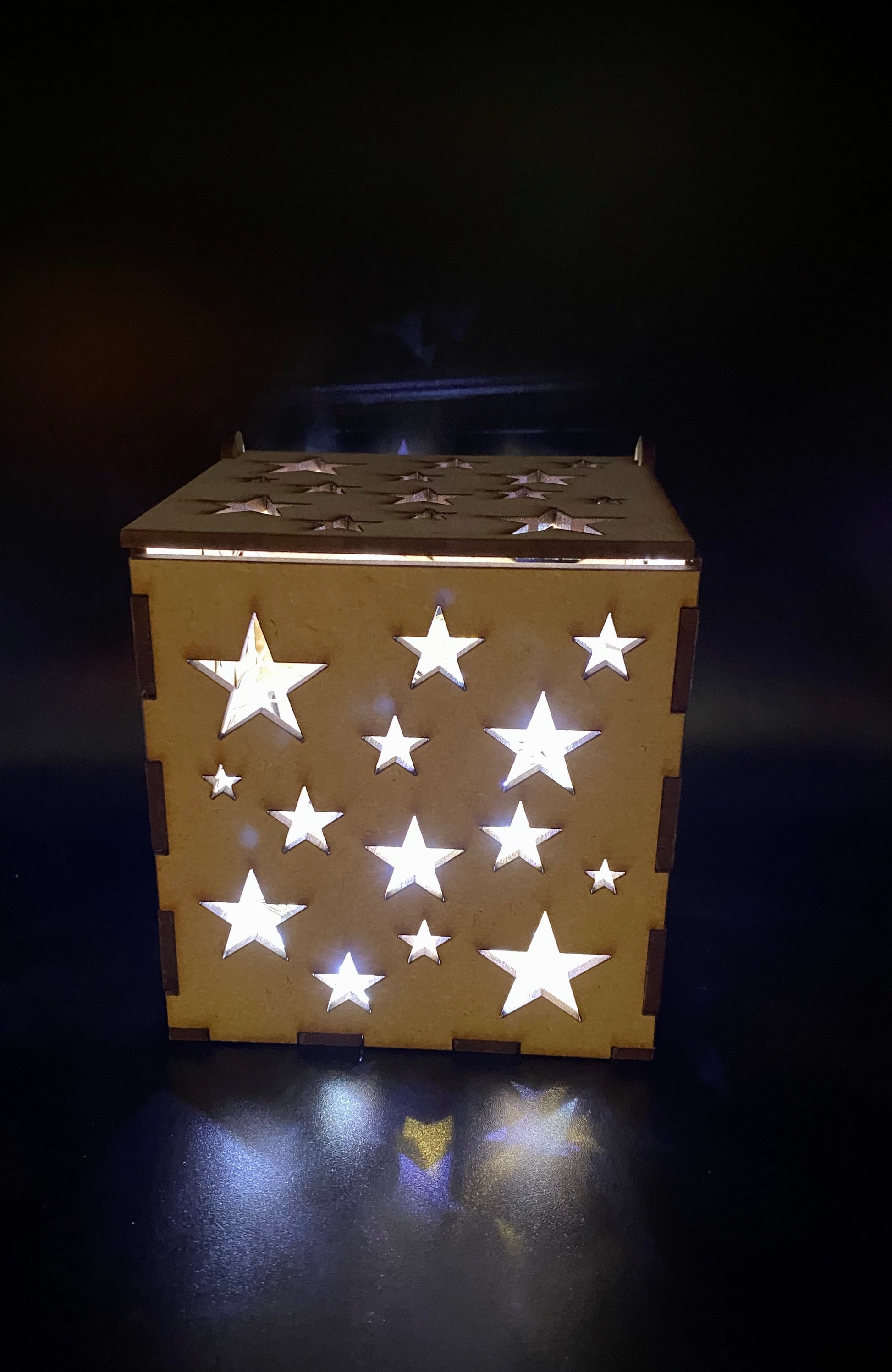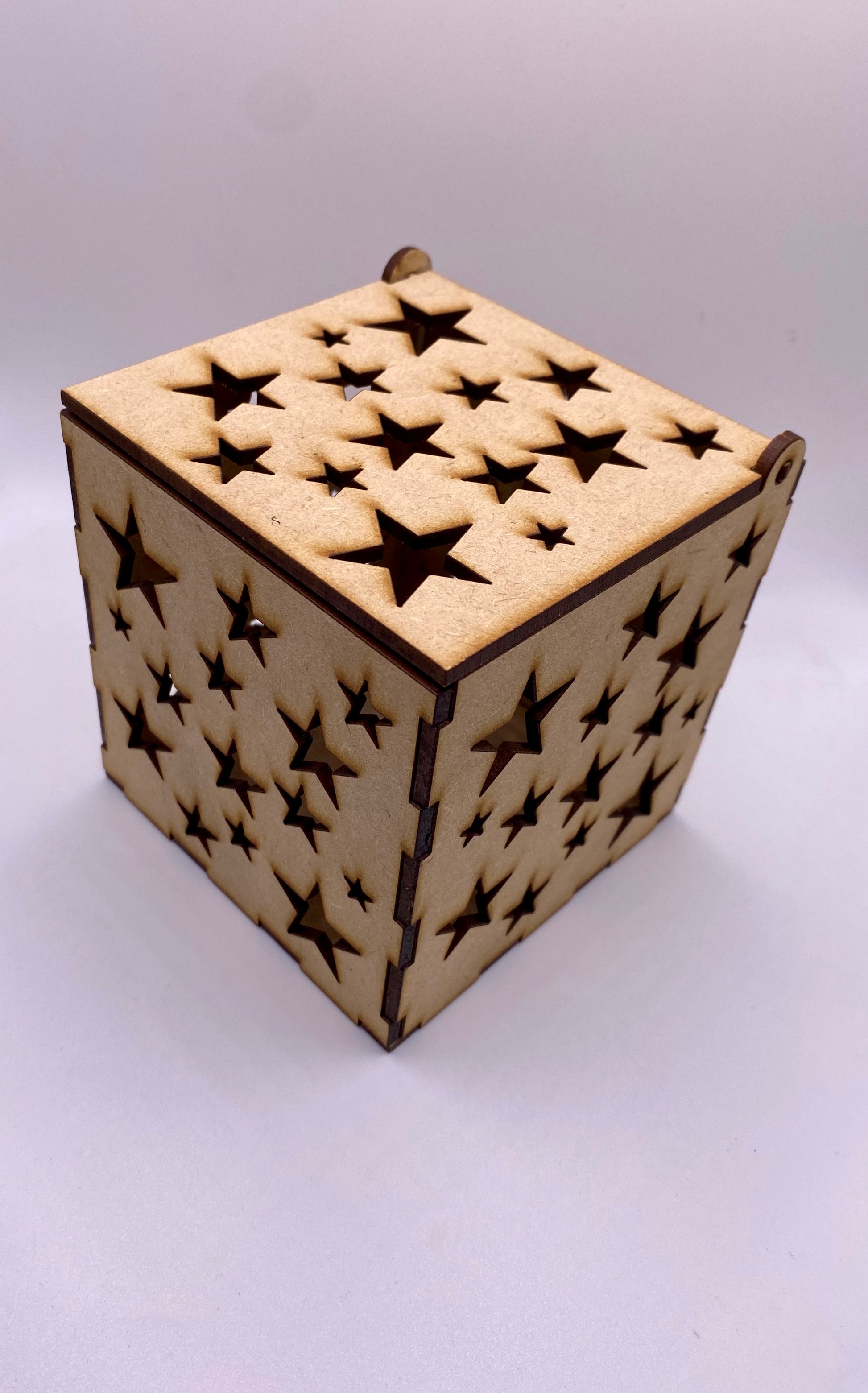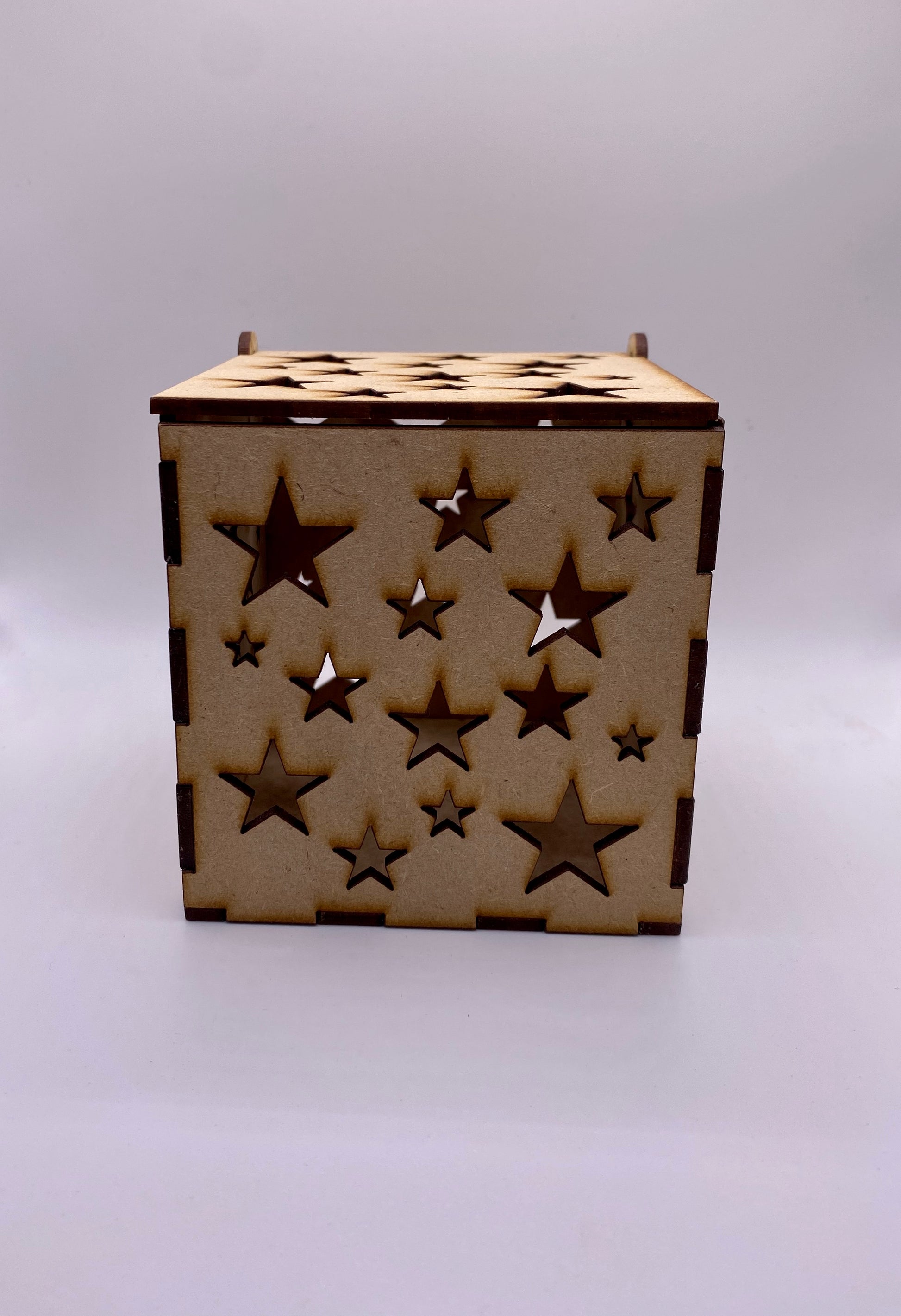 By housing battery-operated candles inside it throws shapes around your room! Decorate it to your own tastes using pens, paints, glitter, gems, etc. The box has a solid base and an easy-opening lid. We only recommend you use battery-operated candles in these boxes and not real candles as they are made from MDF wood and if you paint or varnish them they could become highly flammable.