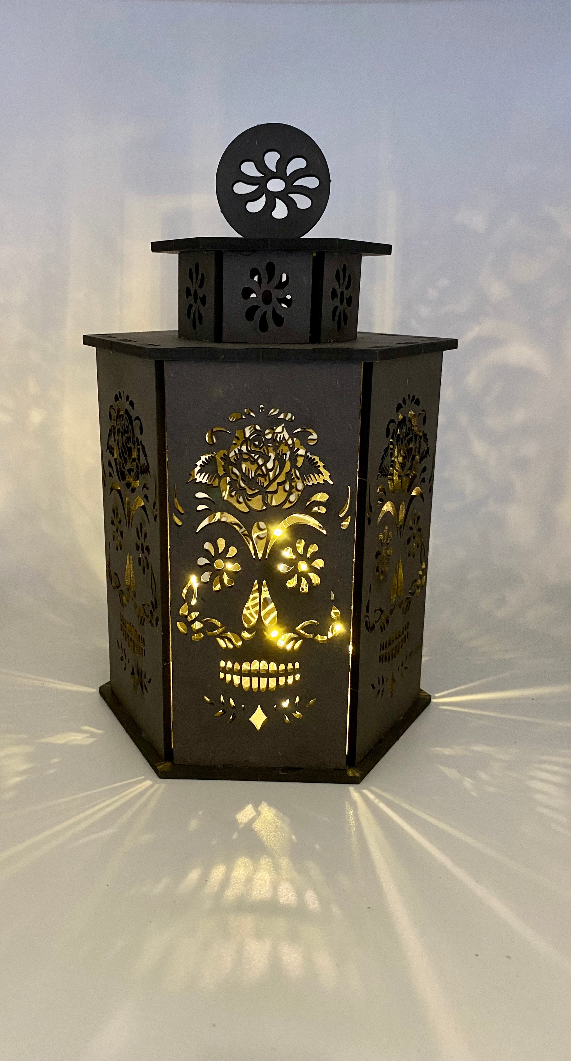 A stunning six-sided Lantern with Sugar Skulls on each panel. The lantern has two opening doors to allow easy access to put your battery-operated candles or LED lights inside.