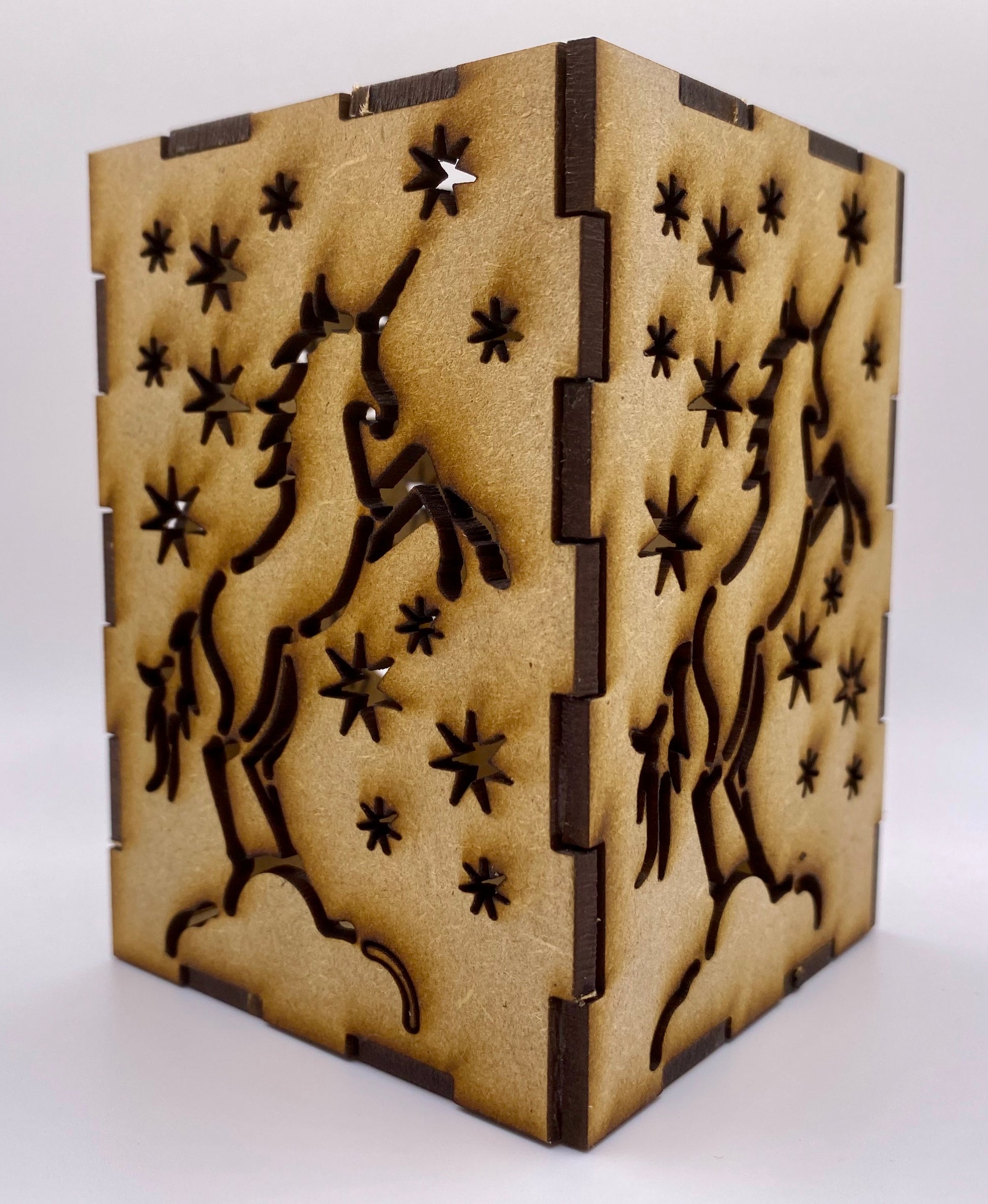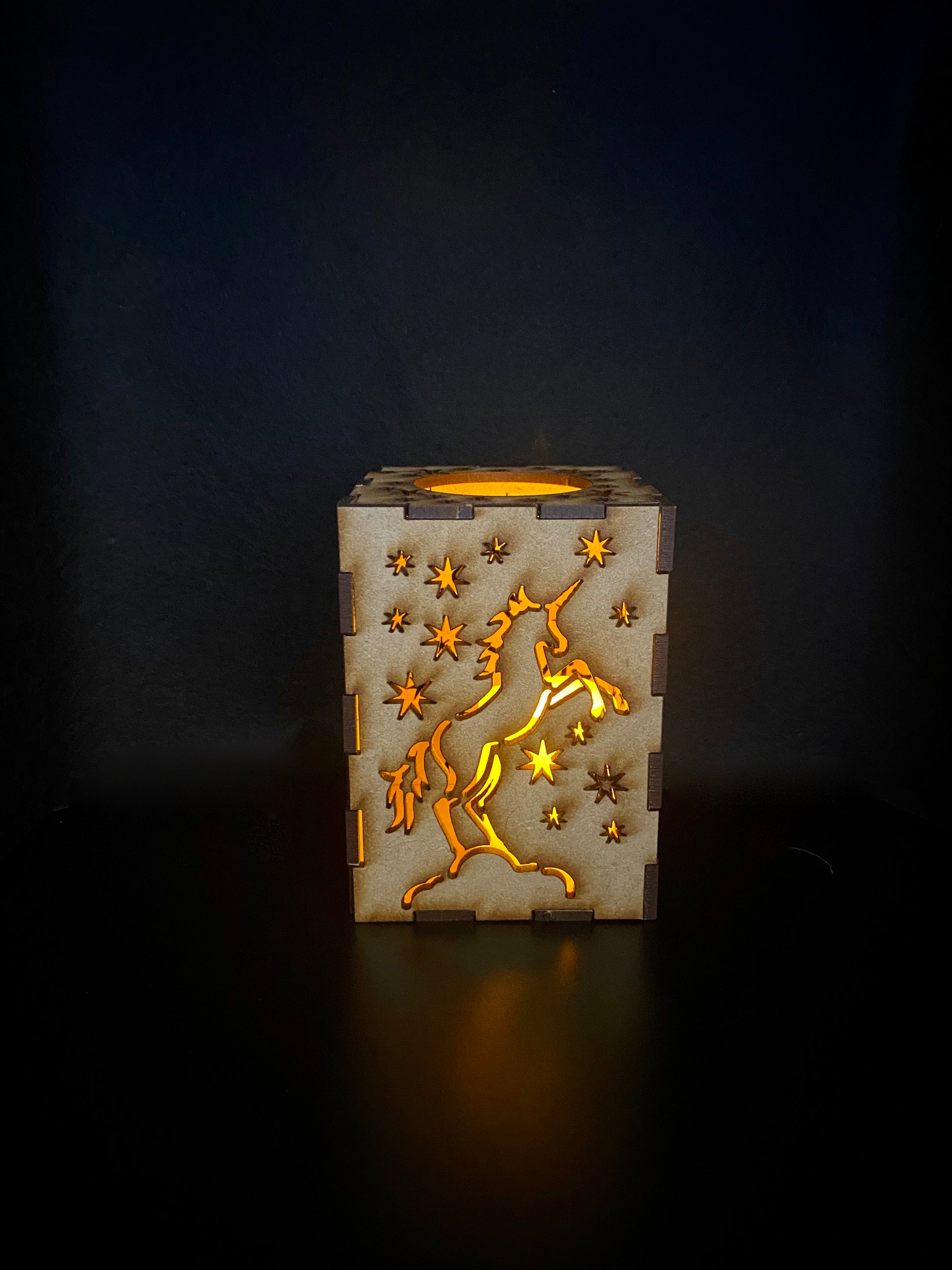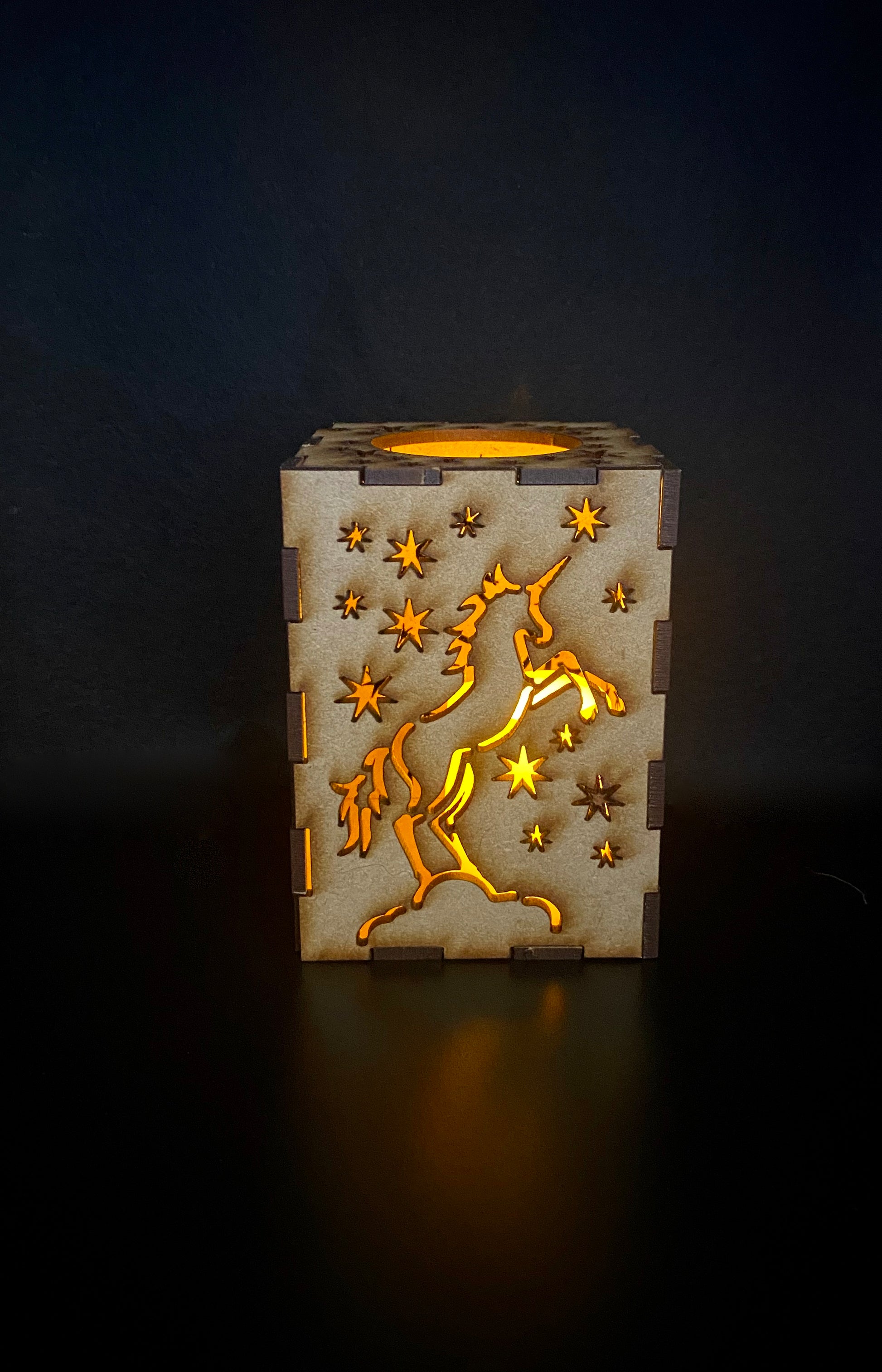 A stunning four-sided Lantern with a Magical Unicorn surrounded by stars on each side. The lantern has a round hole at the top to allow easy access to put your battery-operated candles or LED lights inside. It looks stunning at night with lights inside!