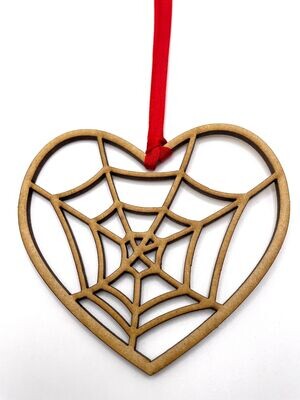 The perfect token for someone special this Valentines Day! Laser Cut for precision with all edges being smooth to the touch, this heart has cobwebs within it. Finished off with a vibrant red satin ribbon loop to hang it up with.