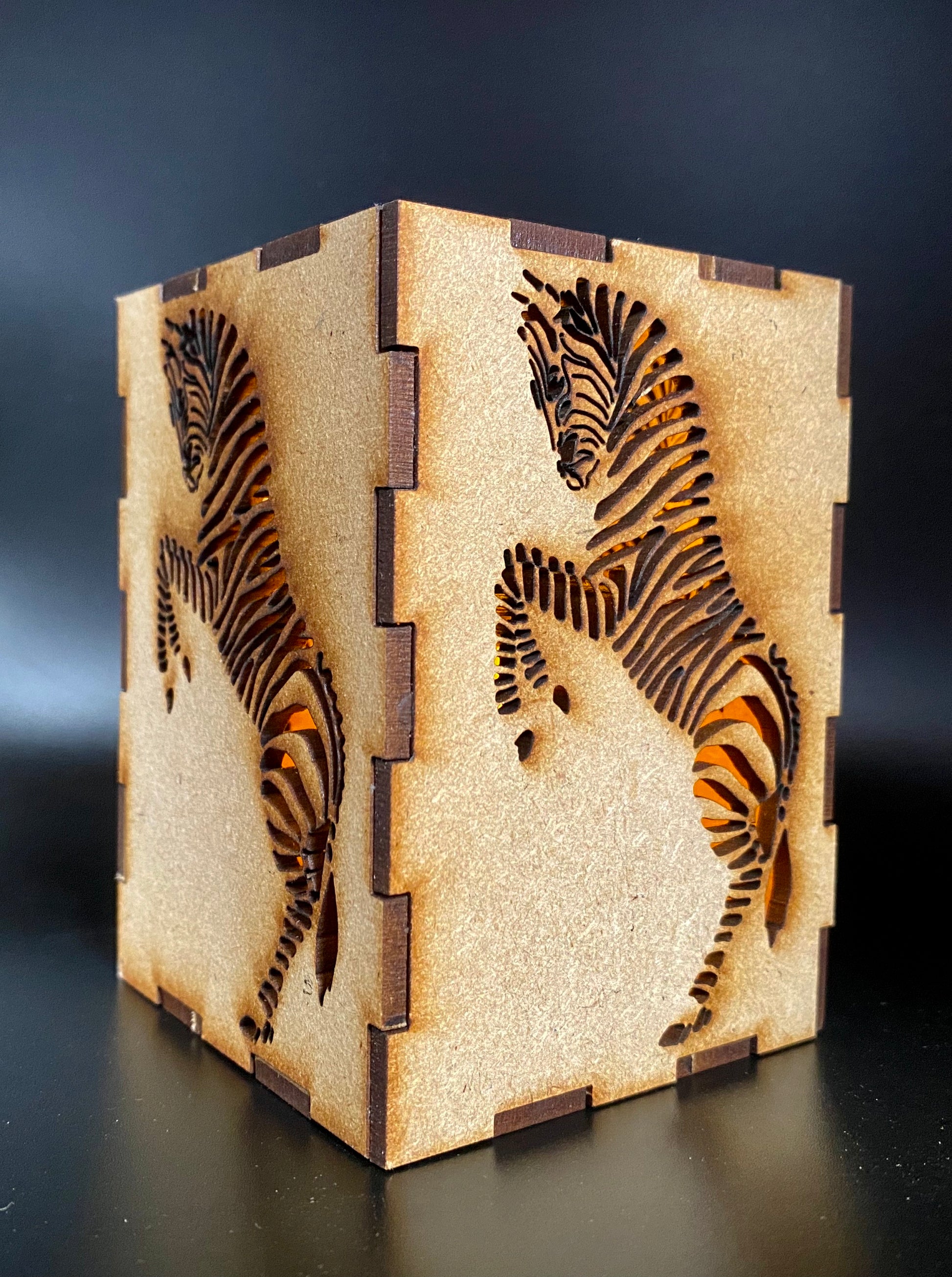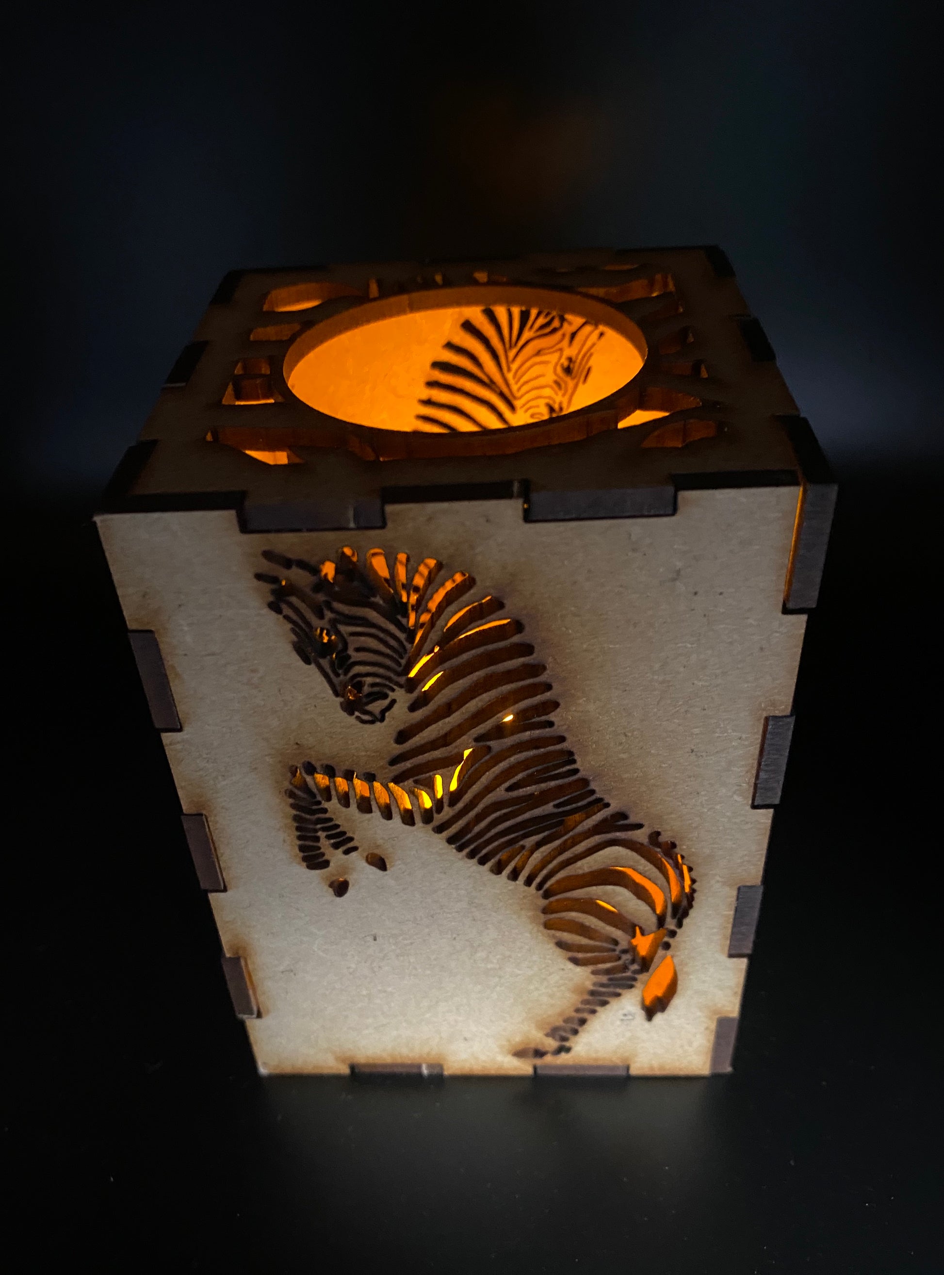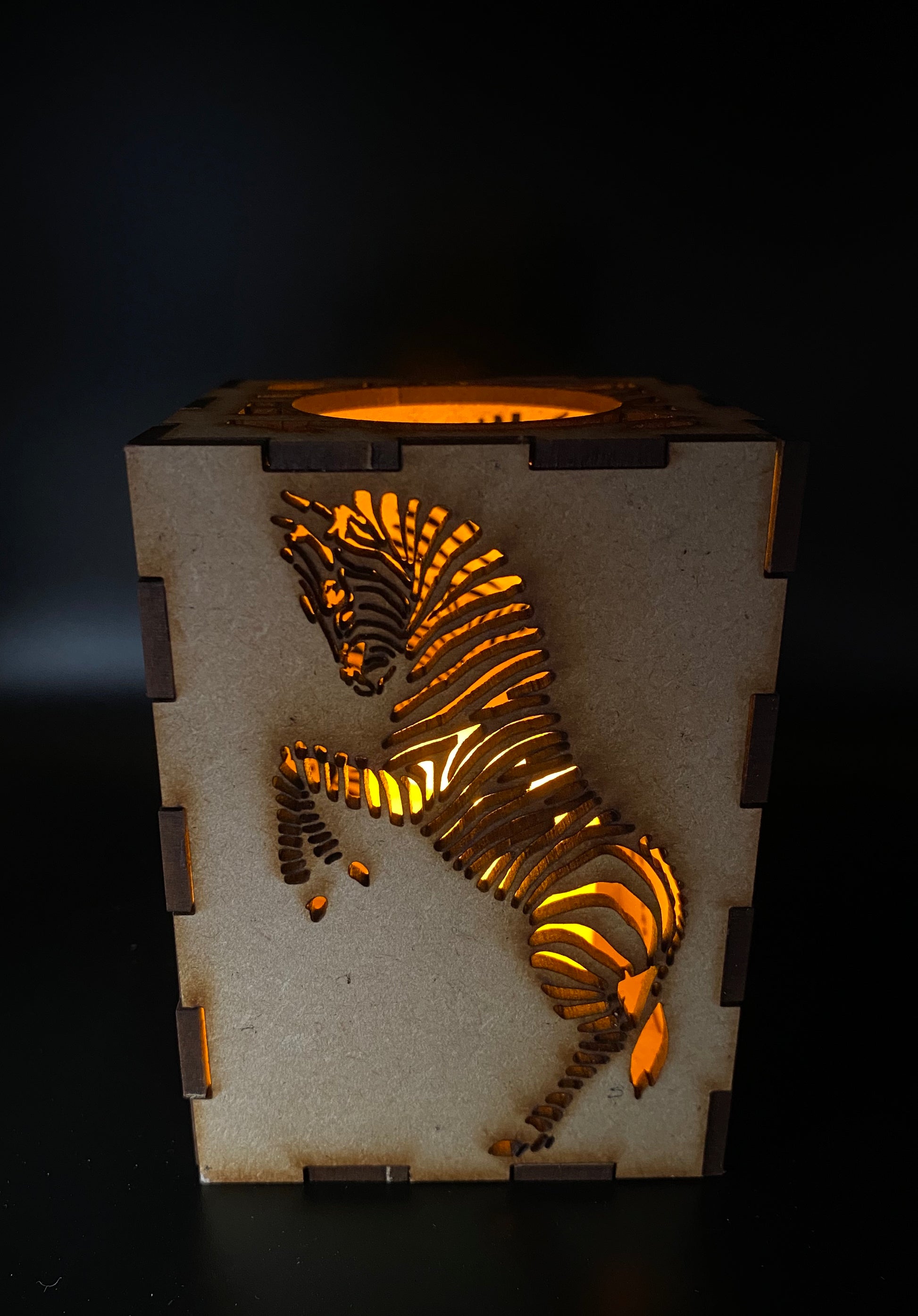 A stunning four-sided Lantern with a Prancing Zebra on each side. The lantern has a round hole at the top to allow easy access to put your battery-operated candles or LED lights inside. It looks stunning at night with lights inside!
