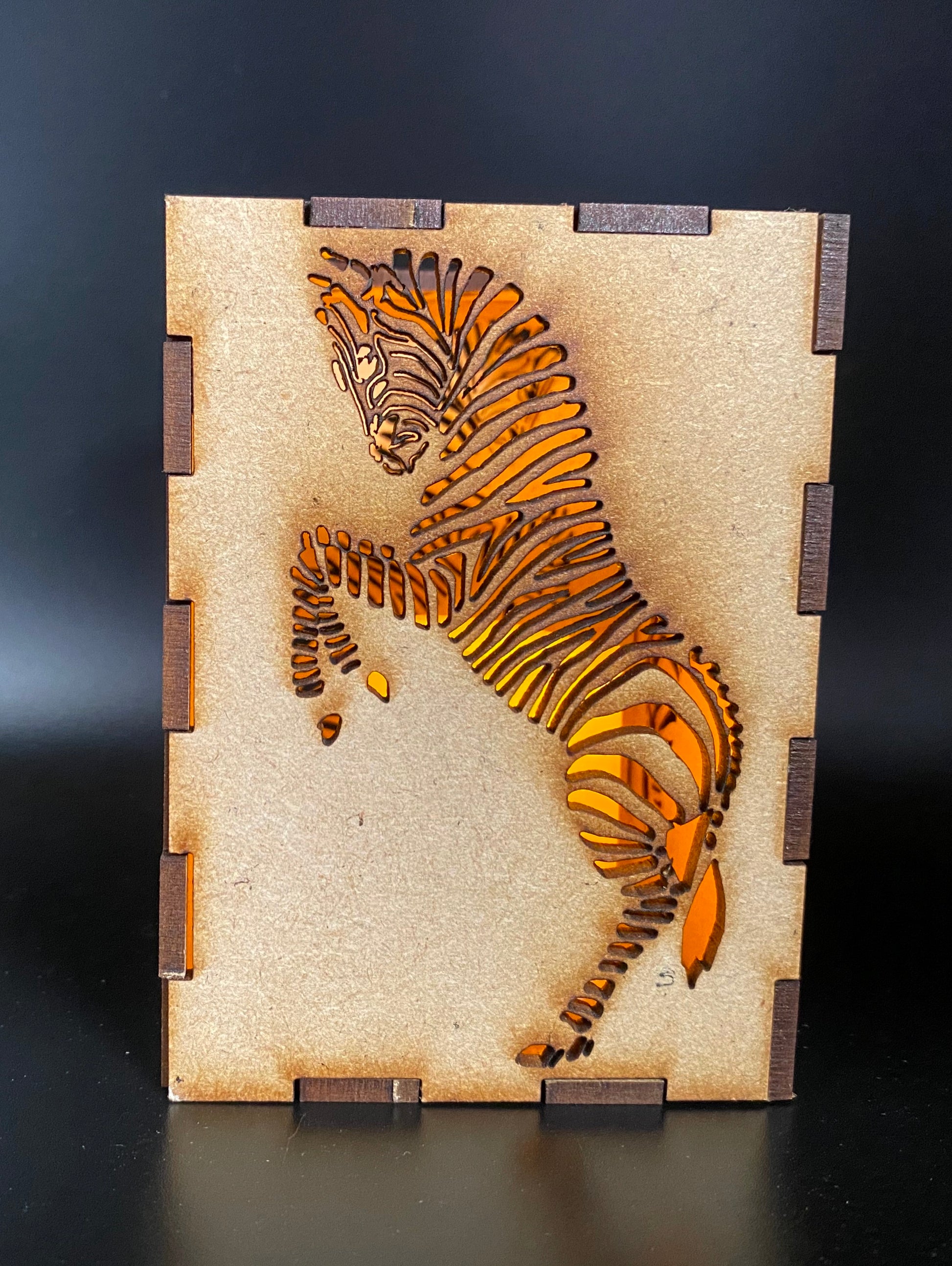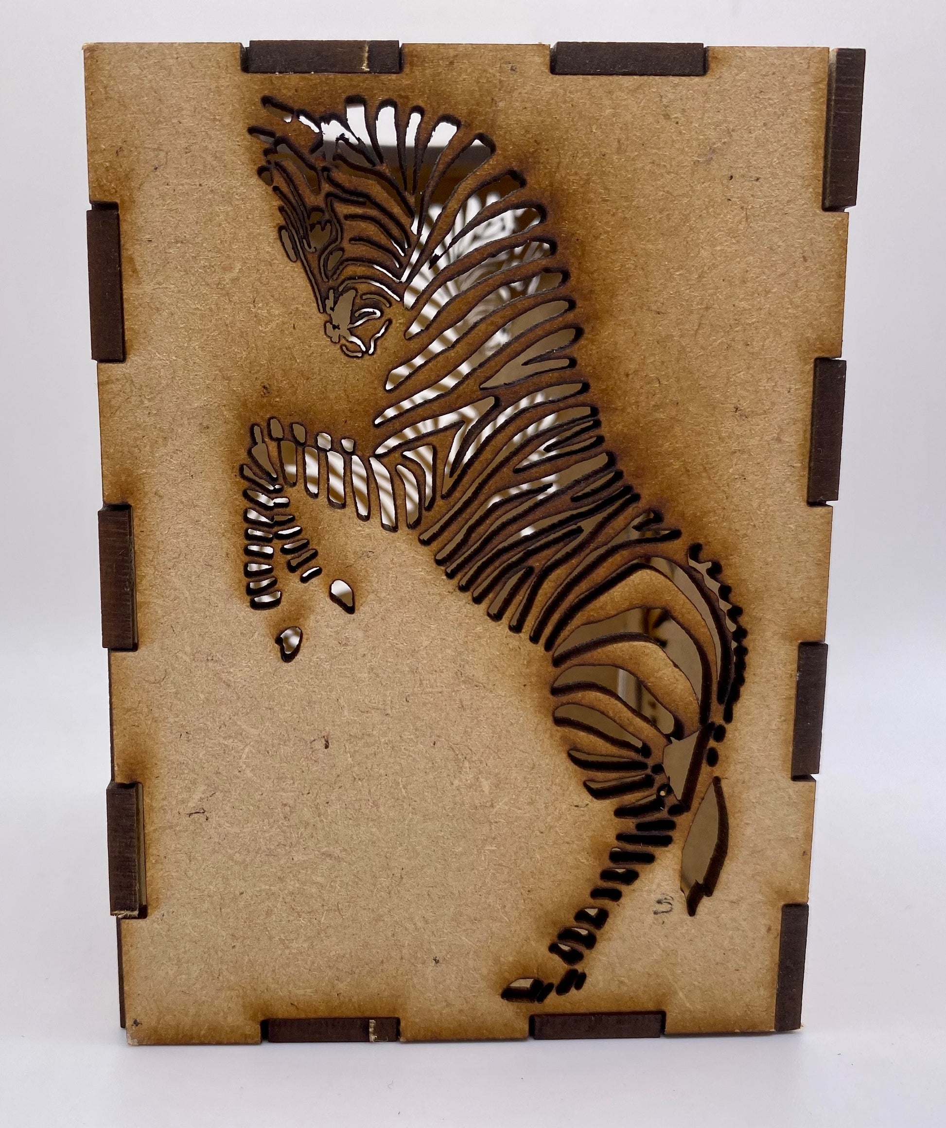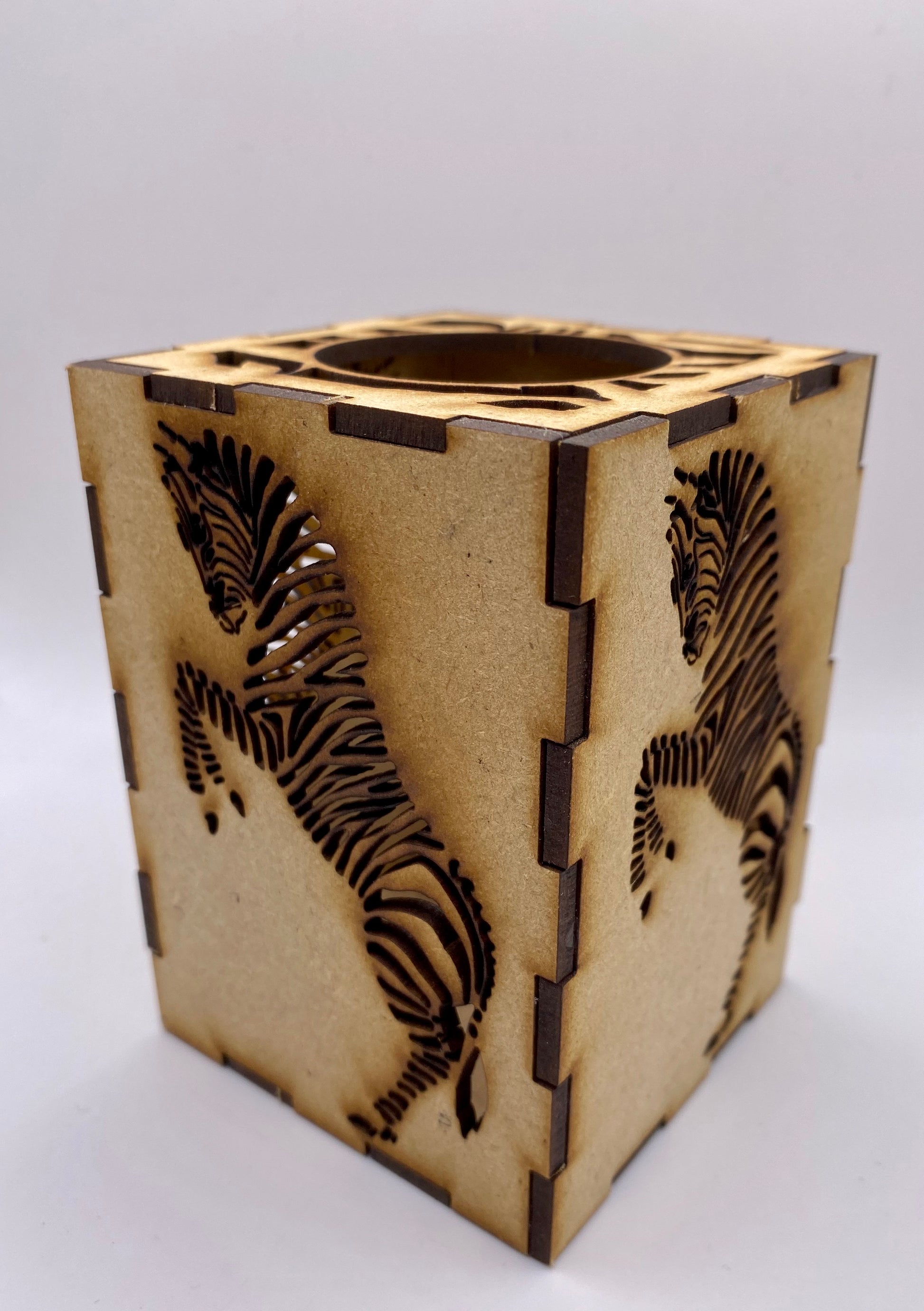 A stunning four-sided Lantern with a Prancing Zebra on each side. The lantern has a round hole at the top to allow easy access to put your battery-operated candles or LED lights inside. It looks stunning at night with lights inside!